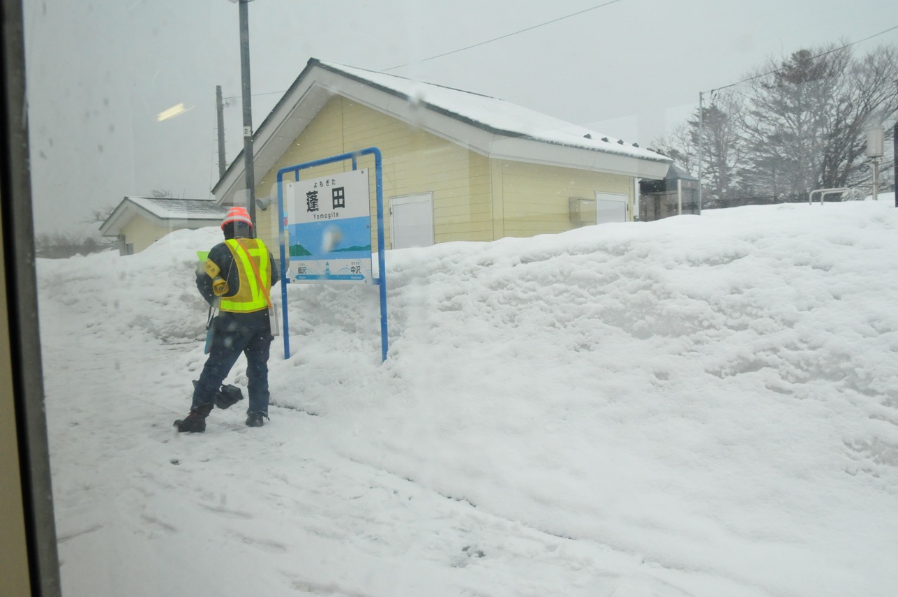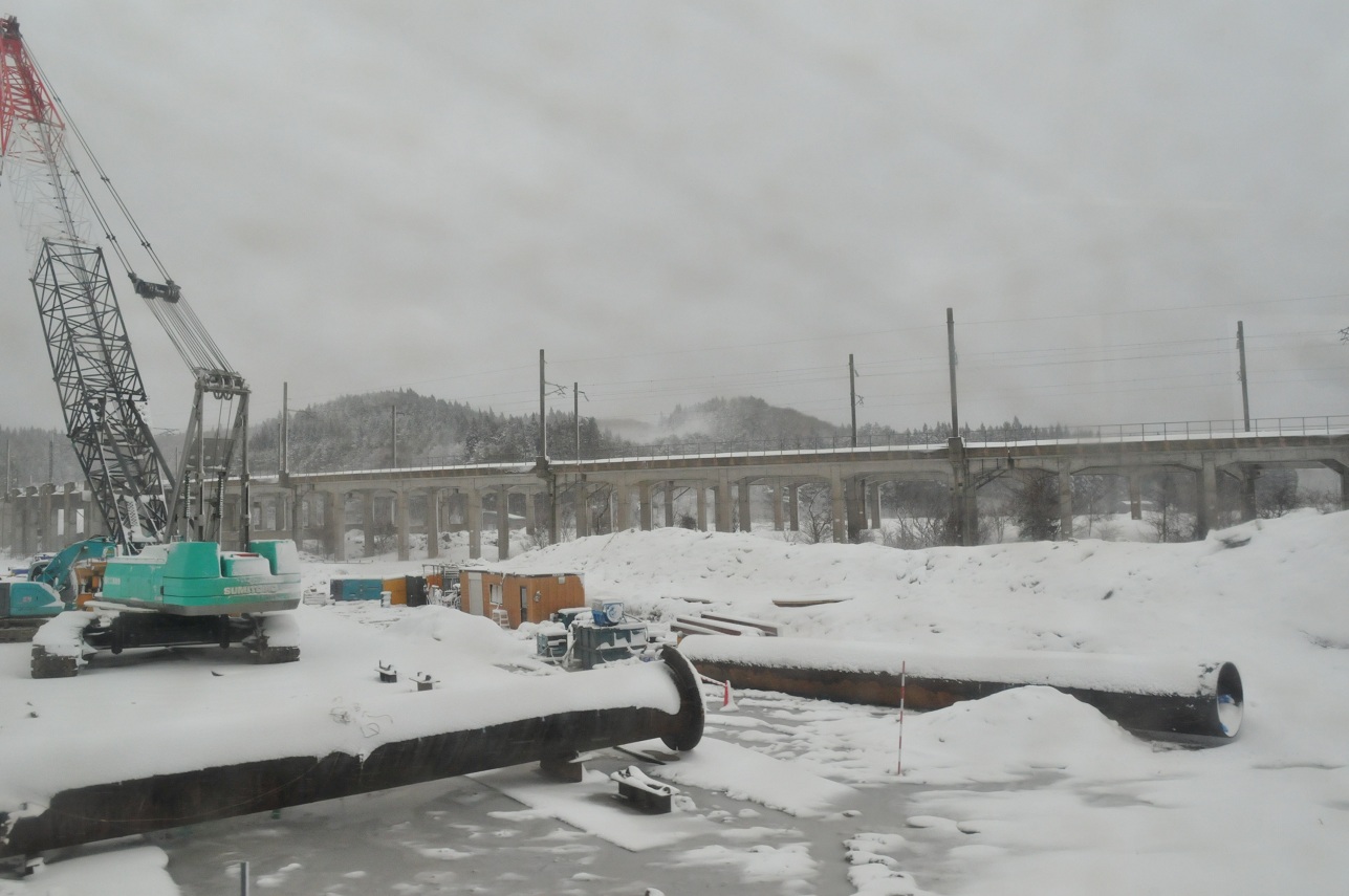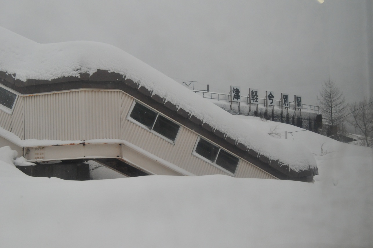 しかしまぁ雪がすごい。昨日の江差線もすごいと思ったけどこちらの方が数段すごい。辺り一面が雪に覆いつくされているという感じ。こういうのを一面の銀世界というのかもしれないけど空が黒いのできれいというよりも北国の厳しさをまざまざと見せつけられる感じだ。中小国で海峡線と別れる。木古内と同様に新幹線の工事が行われている。