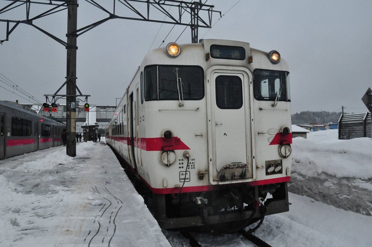 ここで7:07発の三厩行きに乗り継ぐ。この列車の三厩着は7:46。その返しは7:53発。たった7分しか滞在時間はないけど今日のメインは蟹田発11:22の列車で三厩に向かい三厩駅で40分ほど過ごすことだ。なのでこの列車での三厩行きははっきり言って時間つぶしみたいなもんだ。とはいえ7:07発の列車の次の列車が11:22発。4時間以上も列車がないんだから関西の人間的にはせっかくここまで来たんだし次はいつになるのかわからんのでいけるもんなら2回でも3回でも乗っとこうという感じだ。そして車両はキハの48。やっぱり旅情を掻き立てるのはキハ40系だ。何気に僕が一番好きな車両だ。Nゲージでも国鉄色、九州色、広島色、北海道色、そして同系列のキハ400型(利尻)を所有している。ちなみに以前、三宮のぽちに行ったときに何の策略か各地のカラーリングのキハ40系が大量にばら売りコーナーに突っ込まれていた時があり、あまりの光景にどうしていいのかわからなくなってしまい気が狂いそうになったことがある。このときはわけわからん過ぎて結局何にも買えずに店を出てしまった。今思えば盛岡色と日南線くらい買っときゃよかったと今でも悔やんでいる。