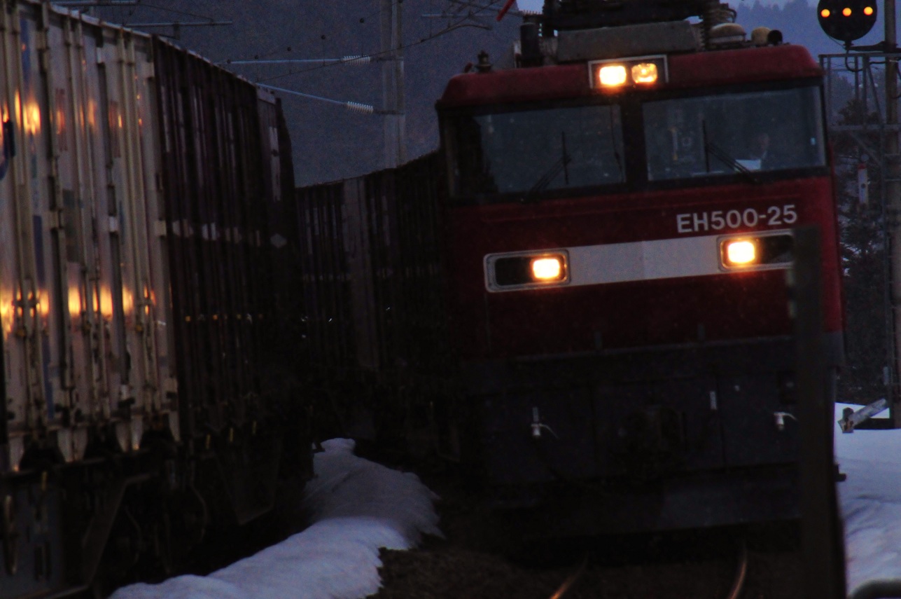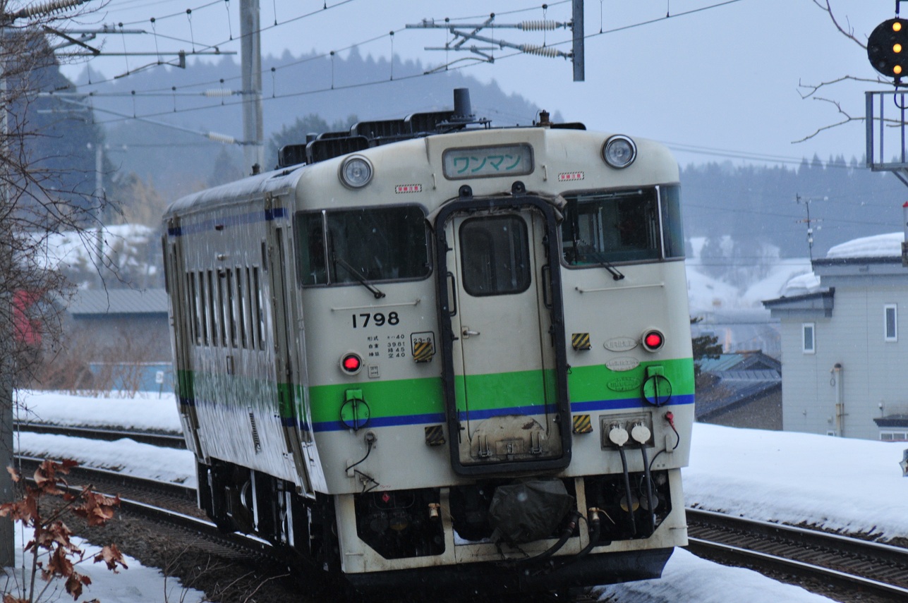 その後16:21、狙いのスーパー白鳥40号が通過。寒い中、耐えがたきを耐えて撮影したけどいやー楽しいわぁ~。寒いのですぐさま待合室に逃げ帰る。あとは16:48発の列車で函館に戻るだけだ。しかし間もなく踏切が鳴り響く。すると木古内側から列車が接近。