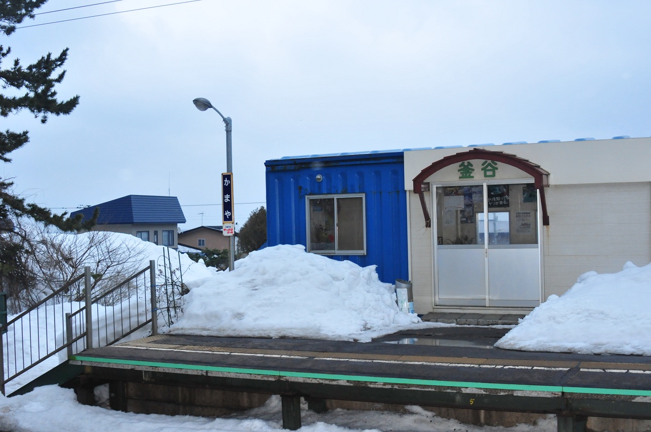 まだ時間はあるけど下見がてらお立ち台へと向かう。ここだなというところは駅のすぐ横。しかしここでも雪国の洗礼を浴びる。深い雪に阻まれてなかなか先へ進めない。一歩歩くごとに積もった雪を踏み抜き雪まみれになる。こりゃスノーシューもってくりゃよかったな。まぁスノーシューまでとは言わないけどワカンがあればよかった。しかしここは引き下がるわけにはいかない。少しずつ少しずつ踏み固め道を作る。「もうここらでいいでしょ」ってとこで再び待合室に逃げ帰る。雪は降ってるし風も吹いてるし寒いことこの上ない。