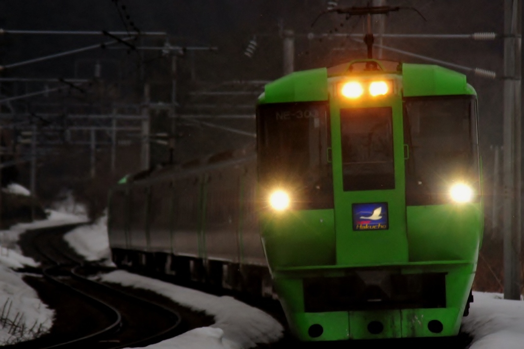 うしてるうちに上りのスーパー白鳥が通過。本来ならばS字カーブを力強く通過する列車を撮影できるはずなんだけど全く手も足も出ない。為す術もなく雪の壁の前から走りすぎるスーパー白鳥を撮影。北海道の冬の厳しさを痛感する。北海道の冬のお立ち台は夏場と同様に考えてはいけないというのをまざまざと見せつけられた。今朝、湯ノ岱で何とか撮影できたのは幸運だったなと思った。