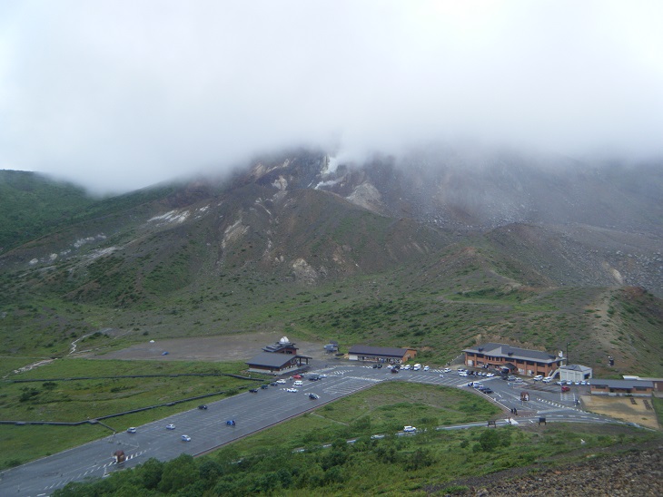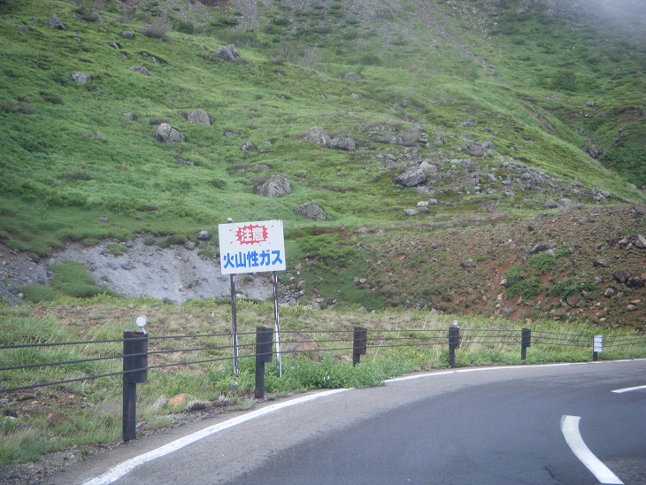 当初の予定では温泉に入りその後この駐車場に戻り一夜を過ごそうと思ったけどやめた。この山行ではえらい目にあったし「夜間は火山ガスが滞留しやすい」とか注意書きがしてあったりして「なんかもう人里に下りたいな」と思ったのである。というわけで下界に下ることを決断する。下界は暑さが懸念されるが正直もうここから離れたい。