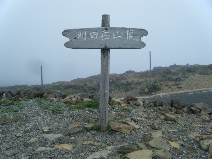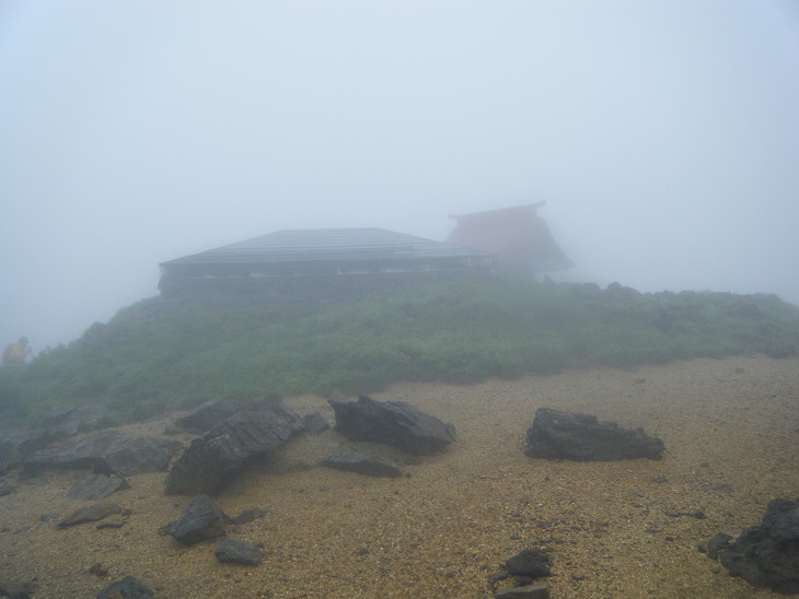 11時25分、終点刈田岳山頂に到着。下界は晴れ間ものぞいていたけどここは完全にガスに覆われている。しかしたくさんの人がいてにぎやかだ。完全に観光地である。とりあえず登山バッチを買うためレストハウスへと向かった。
