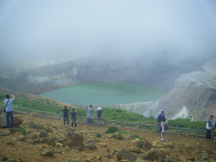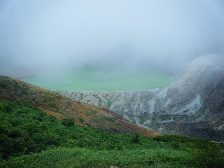 お次はお釜だ。真っ白で何も見えないんだけど一瞬ガスが薄れてエメラルドグリーンの水面が姿を現す。ちゃちゃっと撮影しないとすぐにガスがかかる。