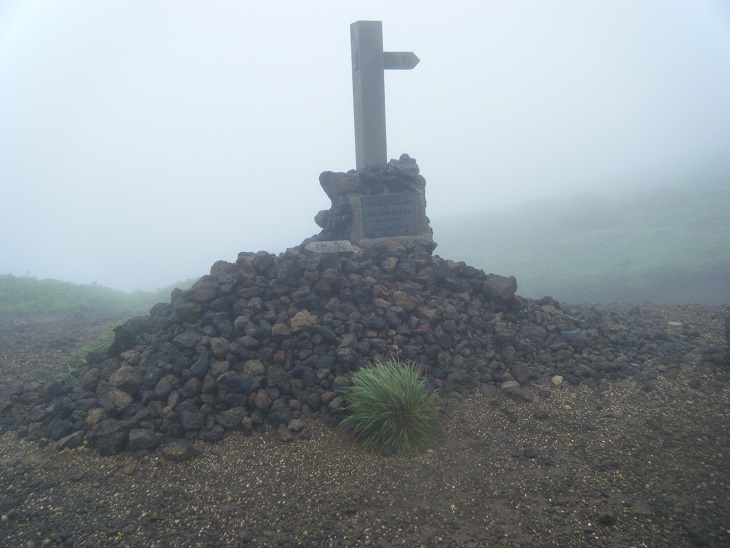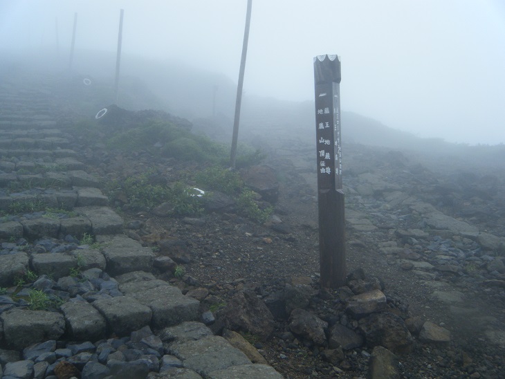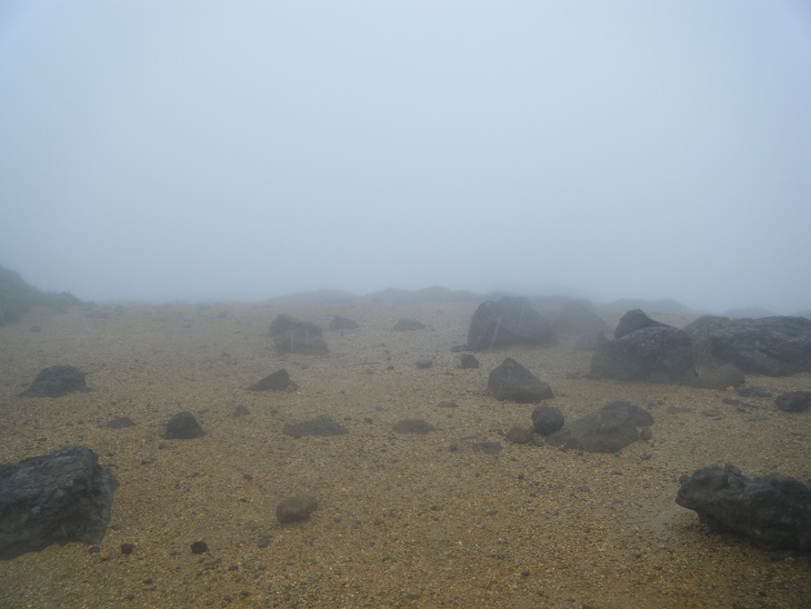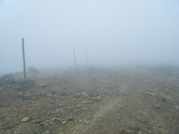 熊野岳に向かう道はだだっ広くてどこが正規の道なのかよくわからん。辺りはガスで視界はない。なんか電柱みたいな木の棒が延々と続いている。なんだこれ?これ沿いに歩けばいいってことか?火山特有の草木のない荒涼とした景観である。濃いガスがかかり、なんだか死後の世界を歩いているようである。