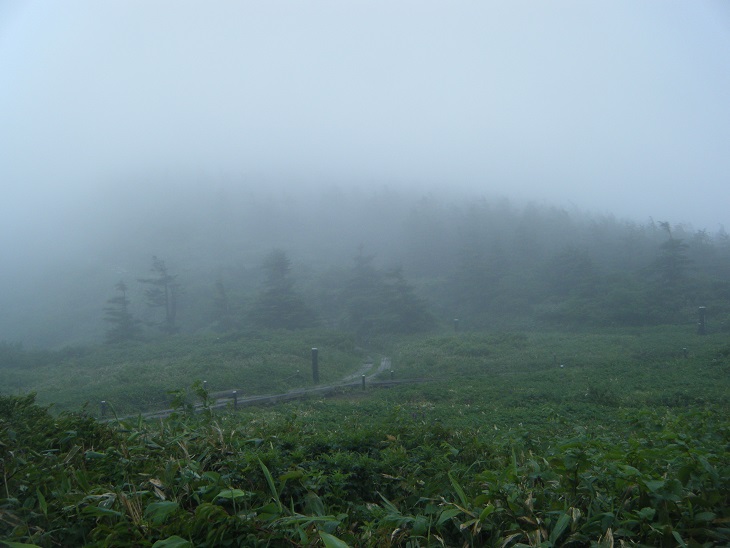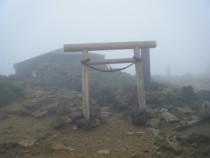 再び熊野岳を目指す。だーれもひとがいないので死後の世界を一人旅である。そして雨が降り始めた。この三日間、すべてこんな調子である。雨は降ったりやんだりを繰り返す。ますます視界が悪くなるのでとにかくルートからそれないようにGPSとにらめっこしながら進む。途中分岐が現れた。避難小屋を経由して登るルートとそれをパスするルートである。僕はパスする方に進むが辺り一面真っ白なので時々「ホントに大丈夫?」と不安になる。すると一瞬霧が切れて避難小屋が見えた。よかった。あってるわ。