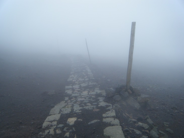 ガスに包まれていても一度コースにはまるとあとはすいすい行けた。再び電柱みたいな棒が僕を導いてくれる。