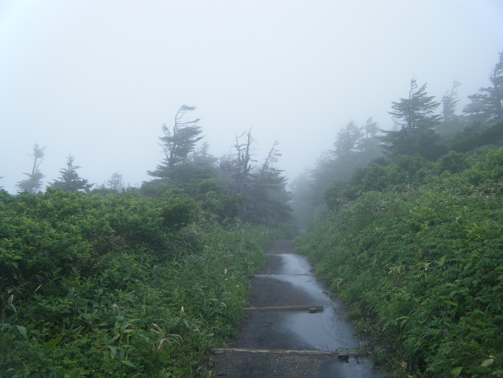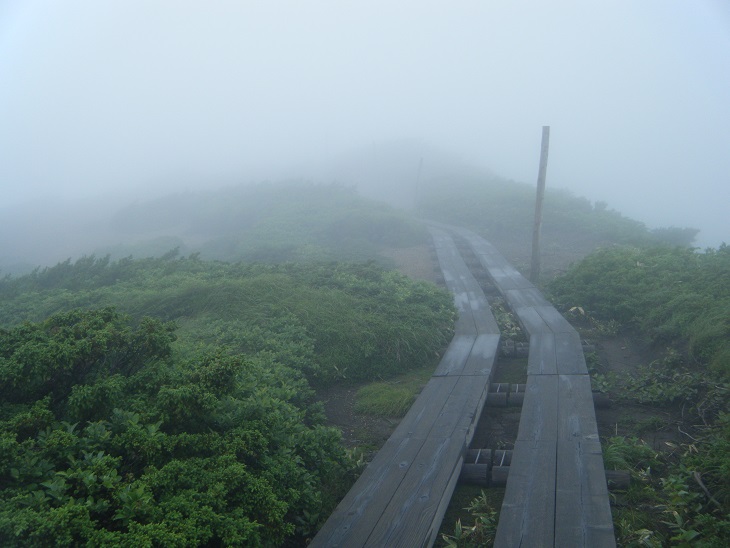 よっこらへと登り始めると前からトレランの二人組がかけ降りてきた。そしてあっという間にガスの中へと消えていく。すごいな、あの人たち。どうやったって真似できんわ。