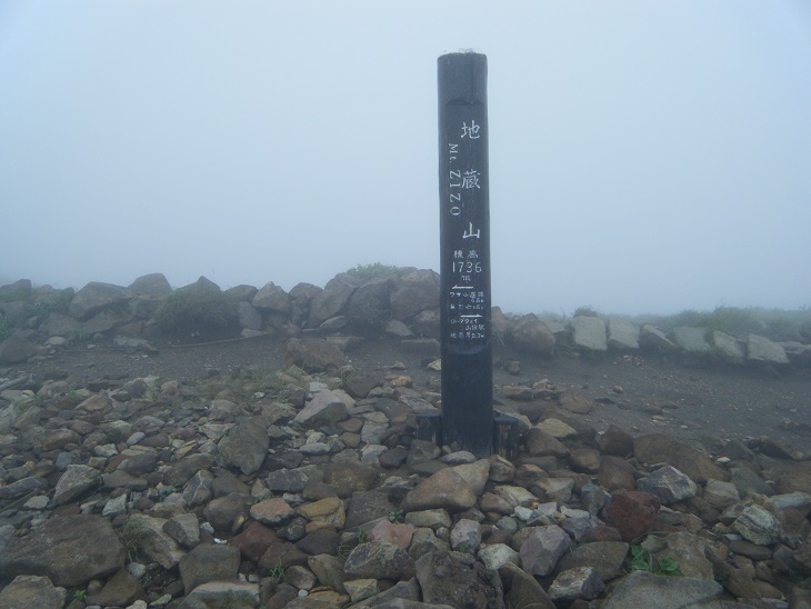 ほどなくしてガスの中に避難小屋が現れ左に地蔵山へのルートがあった。道標を確認し地蔵山へと歩を進める。
