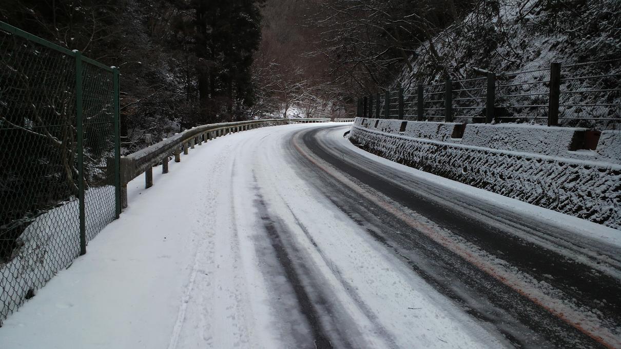 高山への分岐に来るとそこのある温度計の表示は0℃。いや~きましたな。この辺からちらちら粉雪が舞い始めた。トンネルを超えると状況が怪しくなってきた。道の両端に積もっている雪の量がジワリジワリと多くなってきたのだ。初めはほんとに端っこにしかなかった雪がジワリジワリとセンターラインに近づくように増えていく。そしてもう少しで豊能というコーナーに差し掛かったところ