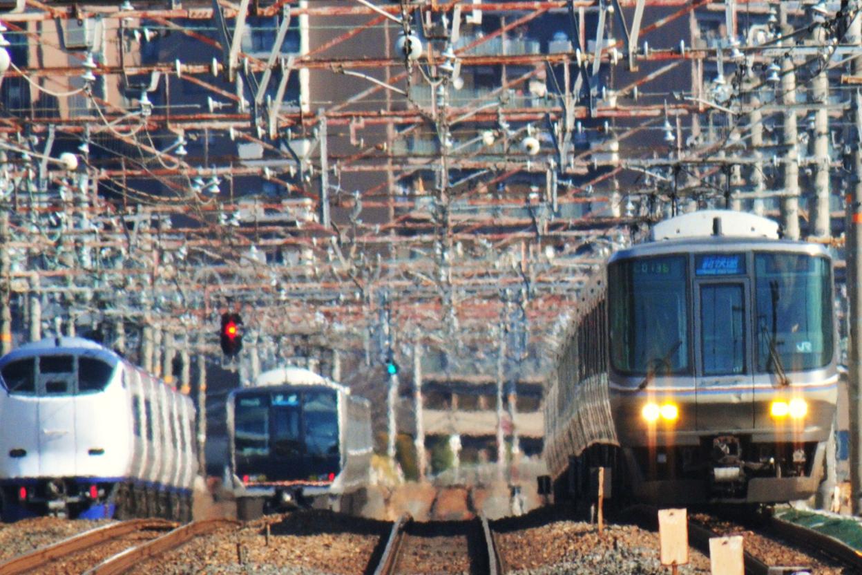 テストを兼ねて試し撮り。つーかこりゃすごい。特急が次から次へとやってくる。サンダーバードにスーパーはくと、スーパーくろしおにはるか。おまけに回送のこうのとりまで走り去っていった。これに加えて225系の新快速に高槻から快速となる普通列車に正真正銘の各駅停車の207系。さらに貨物列車も頻繁に走る。これは撮らなくても見てるだけで楽しい。いつも使ってる尼崎ー三宮間よりも運転密度は確実に高いと思われる。