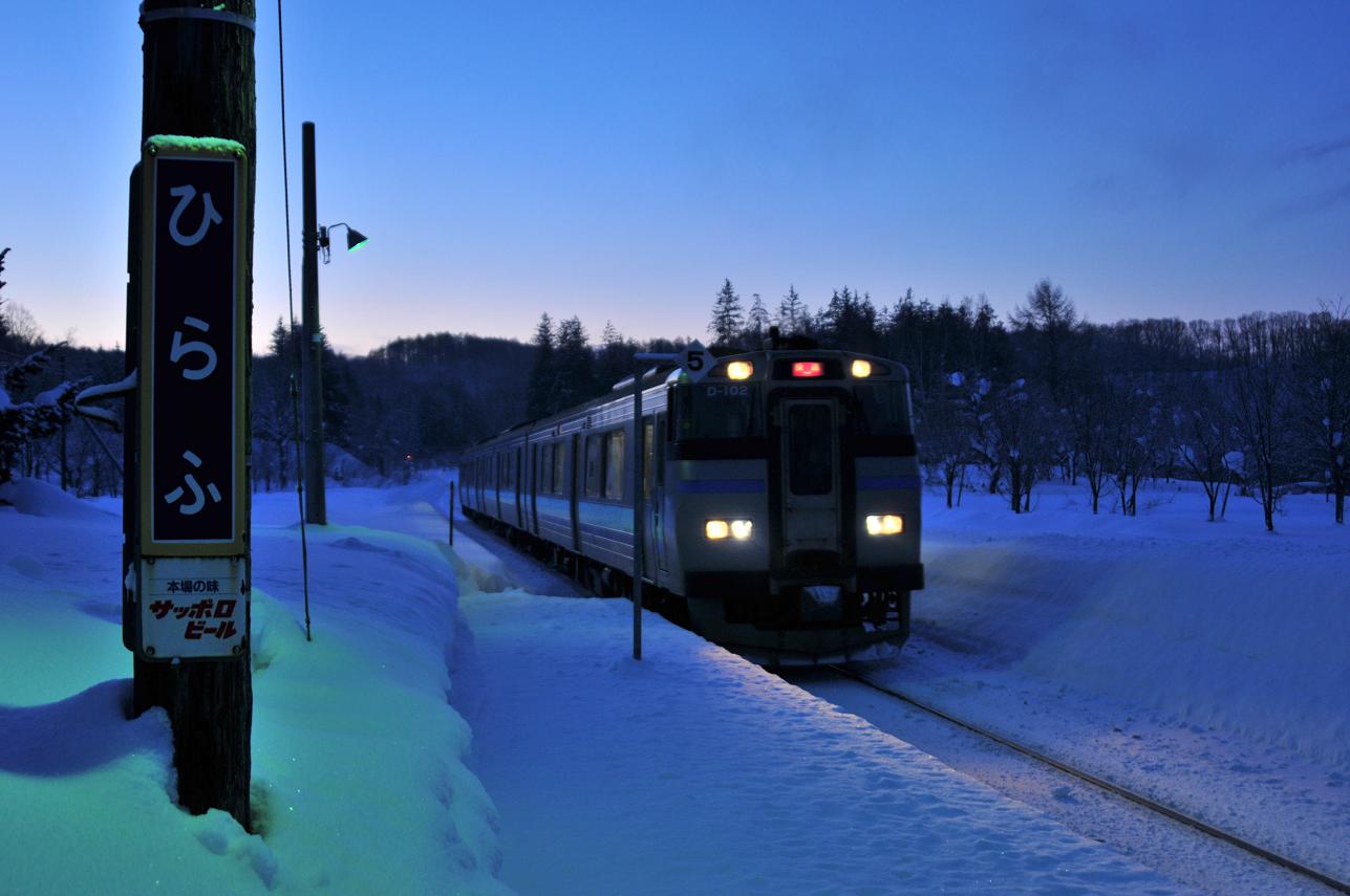 こいつを撮影する。しかし・・・やってもーた。フィルターを外し忘れてヘッドライトが乱反射してしまった。ま、家に帰ったらフォトショップで加工するか。比羅夫の駅から乗り込んだのは僕らだけだった。