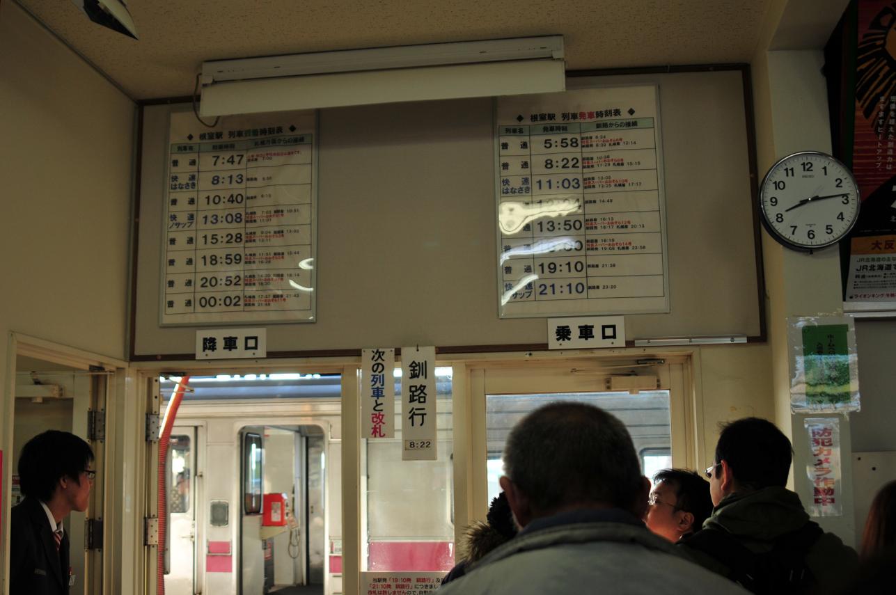 8時13分、釧路からの列車が到着。この列車が折り返し釧路行きになる。釧路行きの改札が始まる。後ろを見ると僕等の後ろの行列もだいぶ長くなっていた。改札口を抜け座席を無事確保。元旦だからまだ混みあわないと思っていたけどそれなりに乗客は多い。乗車率は8割ほどか。それでも昨日の釧路ー根室間よりは空いている。