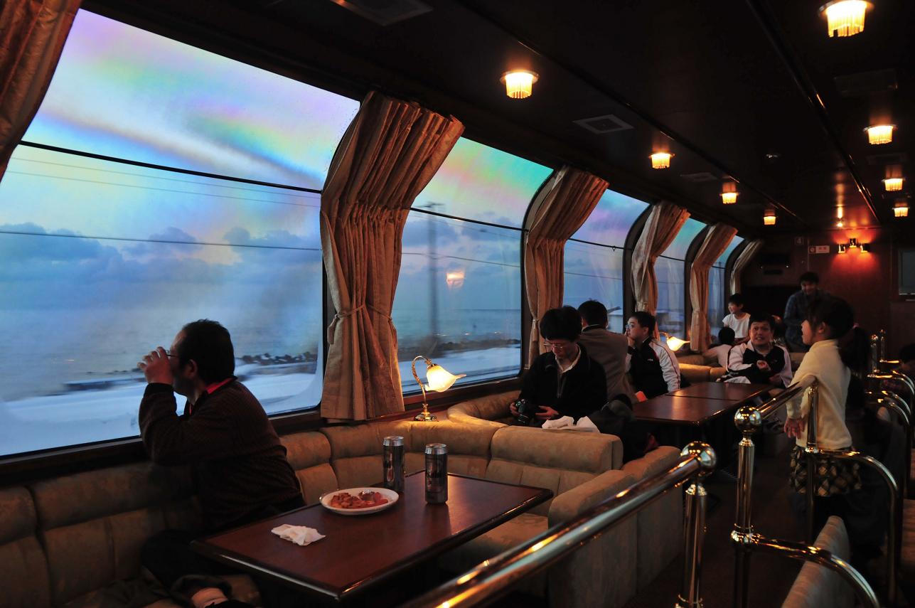 ところでこのコンパーメント、ヤニ臭すぎる。僕はタバコのにおいが大嫌いなのでホントに毒ガス室にぶち込まれたような気分だ。田舎の納屋のようなガラス戸を締めれば幾分マシにはなるけどそれでも完ぺきではない。通路では喫煙者たちが「ぷか~ぷか~」とタバコをふかしている。もっとも腹が立つのが他所のコンパーメントのやつ(ひょっとしたら禁煙車両の乗客か??)がわざわざ僕のコンパーメントのところの通路の引き出し式のイスに座ってタバコをふかすことだ。「お前わざわざここまで来て嫌がらせか!!!」とホントに憤っていた。で、長岡から乗ってきたこのおっちゃんが出入りするときにコンパーメントの引き戸をしっかり締めないのでそのたびに「しっかり締めろや!!」と思いながら寝台の上段から手を伸ばし僕が閉めていた。