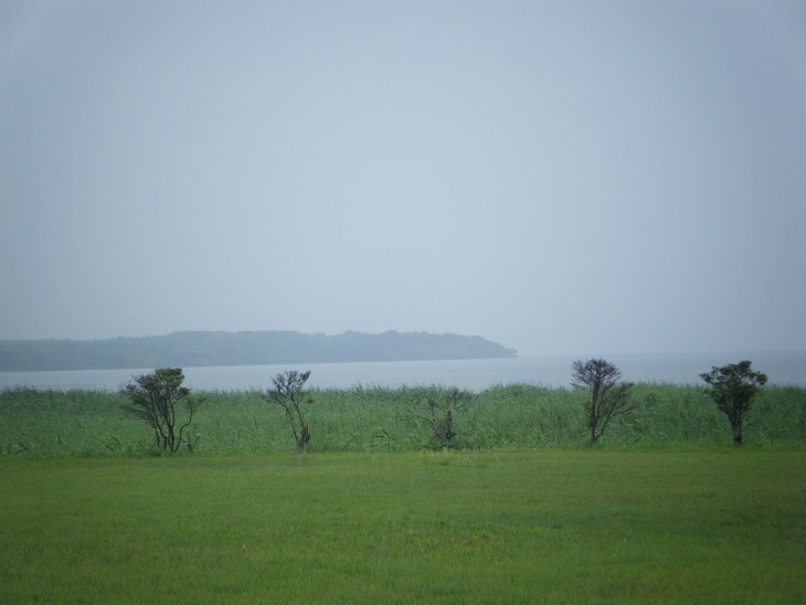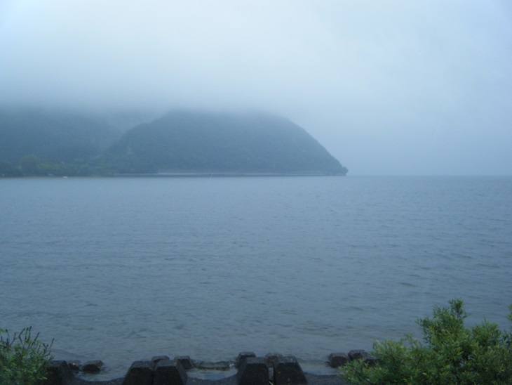 雨がかなり強くなってきた。も~嫌だなぁ。晴れなくてもいいから雨だけは勘弁してほしい。そんなことを思いながら走っていると左手に猪苗代湖が現れた。う~む、でかい。なんだかほんとの海のようだ。ガスがかかっていてなんだかおどろおどろしい雰囲気を醸し出している。とりあえず写真を2、3枚撮って再び走り出した。