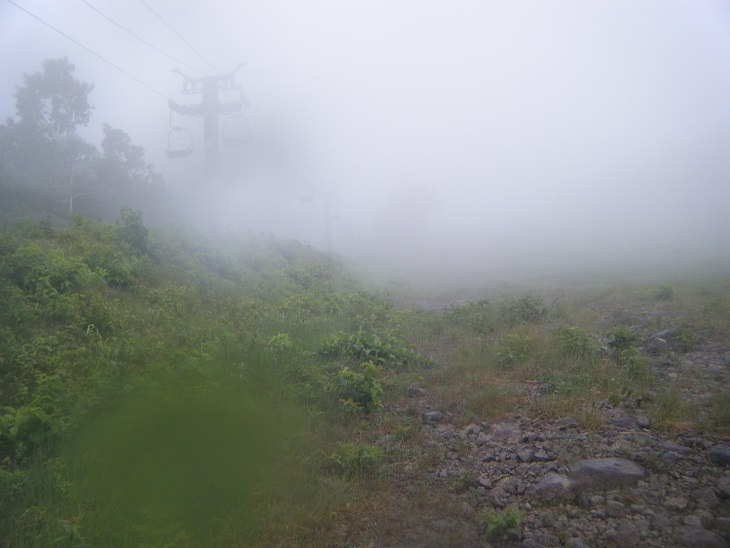 ひざの痛みが嫌な感じだったので迷わずリフトに飛び乗った。そこからは登りの時には停まっていた2番目のリフトも運転再開しておりロープウェイと合わせて楽ちん(インチキ)下山。最後、ロープウェイに乗ってるときにロープウェイの職員さんに「いや~ホントは若女平に降りる予定だったんですよ。でもこの天気なんでやめちゃいました」と話していると「いやいやその方が正解だよ。若女平に下る道は途中馬の背っていう痩せた尾根があってね。先月も一人滑落したんだよ。沖縄から来た人でねぇ。百名山に登るって言っててねぇ。」