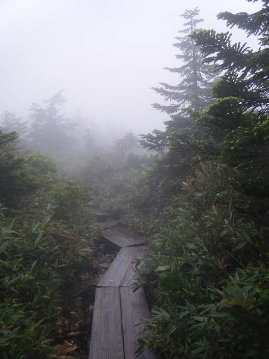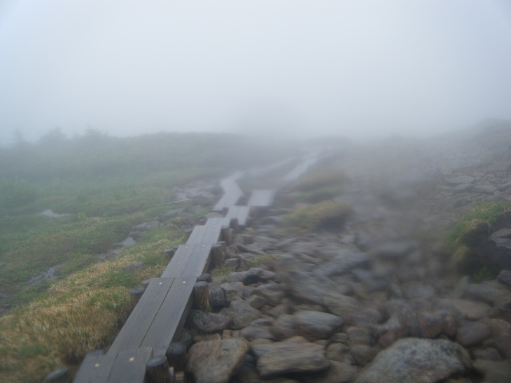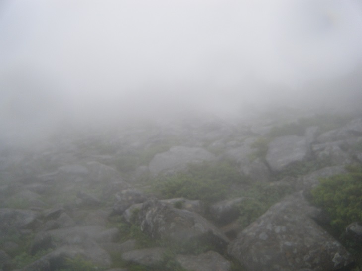 靴の中がびしょ濡れになりながらも尾根筋に出る。すると強烈な風が吹き荒れていた。ガス・雨・風・・・三重苦の地獄登山である。