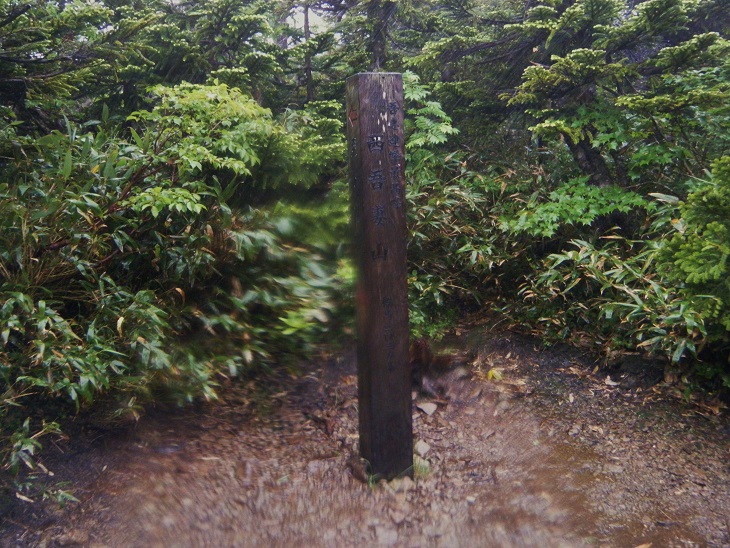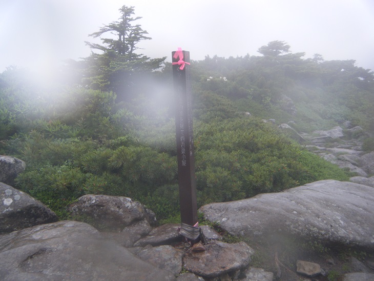 GPSを確認するとやはりルートを外れていた。樹林帯の一本道ならこんなこと起こらんが尾根筋のちょっと開けたとこなので知らん間に外れていた。しか~し、戻ろうにも結構険しいところを突き進んだのでちょっと苦労する。しかもガスで周りが見えん。一瞬ガスが薄くなったときにうまい具合に登山道の道標が見えた。「あそこまで戻ればいいんだな」 正直GPSを持ってなかったらやばかった。地図見てもこんだけガスだとなにもわからん。