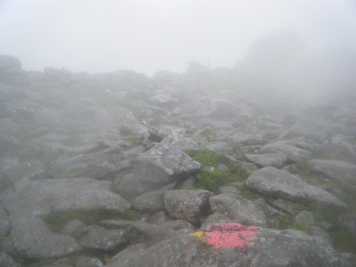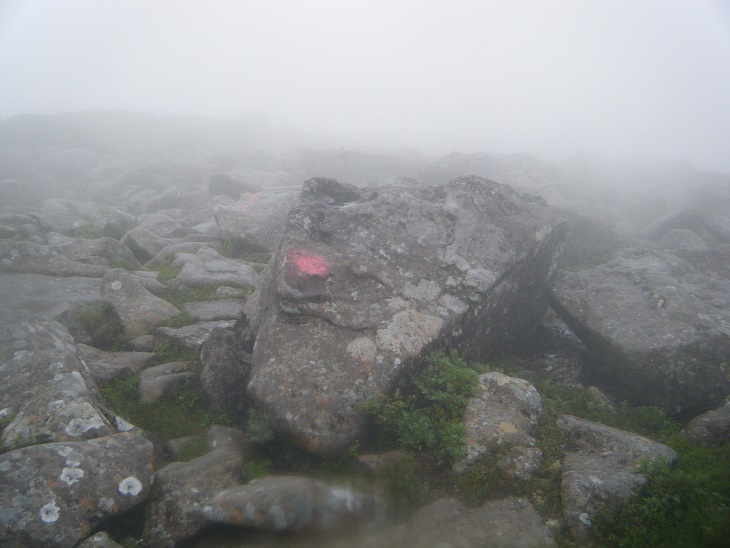 「ふぅ~」やっとこさ登山道に復帰。今度はペンキを見落とさないように慎重に歩く。とりあえず下山だ。時刻は14時10分をまわっている。もしロープウェイが止まっていて下まで自力で降りねばならん状況になれば決して楽勝な時間帯ではない。こんな荒天だし周りにだーれもいないので気分も落ちてくる。視界のないなかをペンキのマークを探しながら歩いていく。ふと「バサバサバサッ」と何かが風にはためく音がして顔を上げると・・・「げっ!!!」