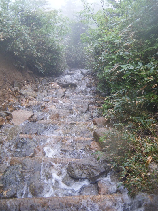 下山を続ける。この大雨であちらこちらで登山道が沢と化している。
