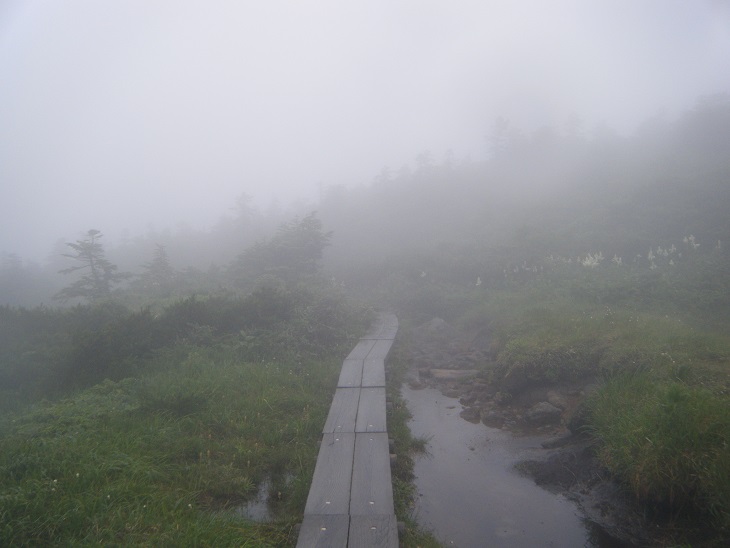 そんなことを思いながら車は白布峠に差し掛かる。雨はさらに激しくなりガスが立ち込めてきた。う~ん、こんな日に登るのは嫌だなぁ。しかしこの辺りは地形的に非常に険しい。峠を登りきり下りに差し掛かるあたりから特に険しくなる。気づけばすでに山形県に突入している。登山口の白布温泉が近づくにつれだんだん不安になってきた。「こんな日に登ってる奴なんておるんかいな??つーかこの天気でちゃんとロープウェイは動いてんのか??」