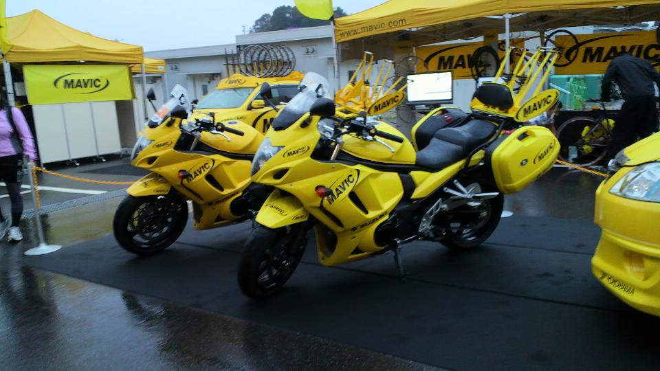 とりあえず受付を済ませる。去年は結構ならんだけど今年は出陣の時間が遅かったために全然ならぶことなく受付完了。時刻はすでに6時40分になろうかというところ。早いとこコースに出ないと試走ができなくなってしまう。晴れていればローラーでアップをしようと思ってわざわざ家から持ってきたけど雨降りだったためにローラーでのアップは中止。てことなので試走でアップも兼ねなければならない。と、コースに向かう前に目に飛び込んできたマヴィックカーをケータイでパチリ。バイクもパチリ。