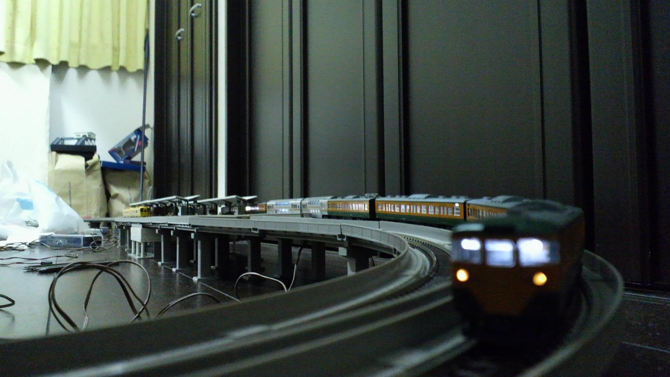 それから1週間。昨日レールを組んでやっとこさ本格的に走行。室内灯も付けた。113系6両にサロ213を2両連結という実写ではありえない編成ながらなかなかダイナミックでかっこいい。ちなみにスカ色の方は元の113系もろとも室内灯は付けていない。