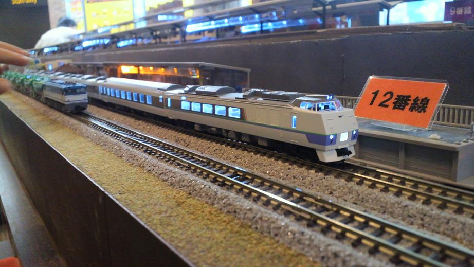 で、タムタムに到着し早速受付。12番線をチョイスして早速走らせる。トップバッターはEF64の貨物列車だ。いやいや自宅じゃこんな大掛かりな事できませんて。「いやー楽しいなぁ。」と思ったのもつかの間、2周目に入ったところで脱線。その後も一周して戻ってくると10両が8両になってたり、そのままさらに一周させると先頭に2両の貨車がついて戻ってきたりと何とも微妙な感じだ。レールをチェックすると継ぎ目に若干の段差があってそこでトラブルが起こっているようだ。オホーツクもスーパーおおぞらも同様にポイントでの脱線やなんかでまともに走れない。