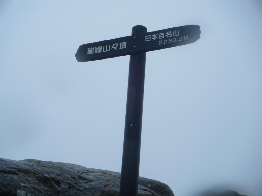 山頂直下の岩をよじ登り樹林を抜けると視界が開けて頂上へ飛び出る。所要時間は約2時間20分。しかし岩場の山頂からの視界はガスによりゼロ。まっしろしろすけである。山頂にはだーれもおらず僕一人。最後に追い抜いた人たちがここまで来るにはまだ少し時間がかかりそうだ。仕方がないので登頂の証拠写真は自分撮りとなる。慣れていないので何度も失敗しながら撮影。汗と雨でベタベタの顔にフラッシュをたいて撮った写真は顔面がギトギトテカテカで見るに堪えない。フラッシュをたかないと逆光で真っ黒だし、たくと脂ギッシュなどぎつい顔になる。まぁ今さら顔のこと言っても仕方ないのでこれで良しとする。