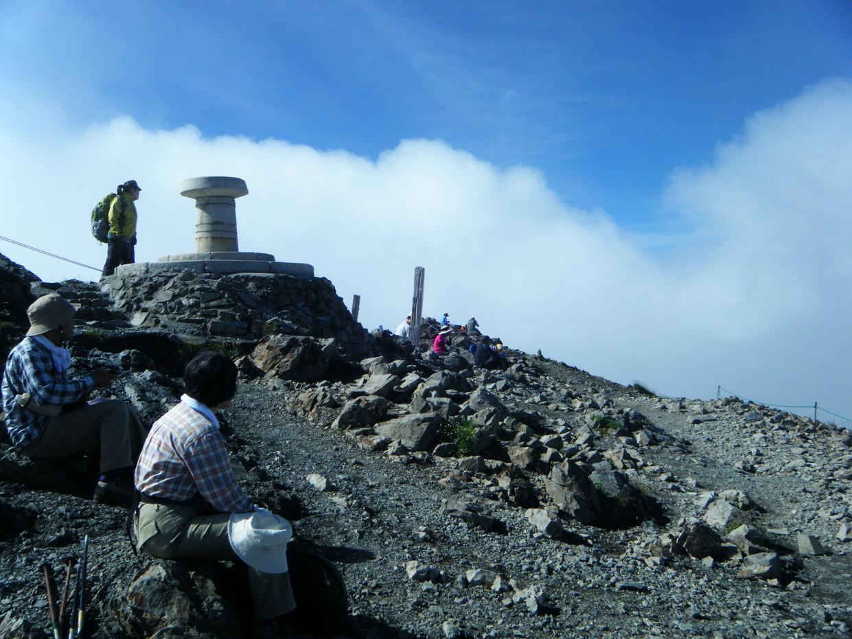 ど数字で見ると標高差は200mほど。実際登ってみると大した登りではなく小蓮華山山頂に到着。ここで小休憩をとっていると大池方面からトレランの人がやってきた。いやートレランの人たちってすごいと思う。去年も僕らが3日がかりで歩いてきたところ(中房温泉から蝶ヶ岳)を半日で追い付きその日のうちに下界まで下りちゃうというのだから驚異的だ。まぁ背負ってる荷物の重さの違いは話にはならないけどそれでも同じことが出来るかと言われれば絶対無理。あの人たちは登山というよりは陸上競技の延長といった方が正解だと思う。で、今回のトレラン氏は爽やかに言った。「ハクバ岳はどれですか?」 いやー残念。やっぱ登山界でなく陸上界の人なんだなぁと改めて認識。「シロウマ岳」ときちんと読めてたらかっこよかったのになぁ。