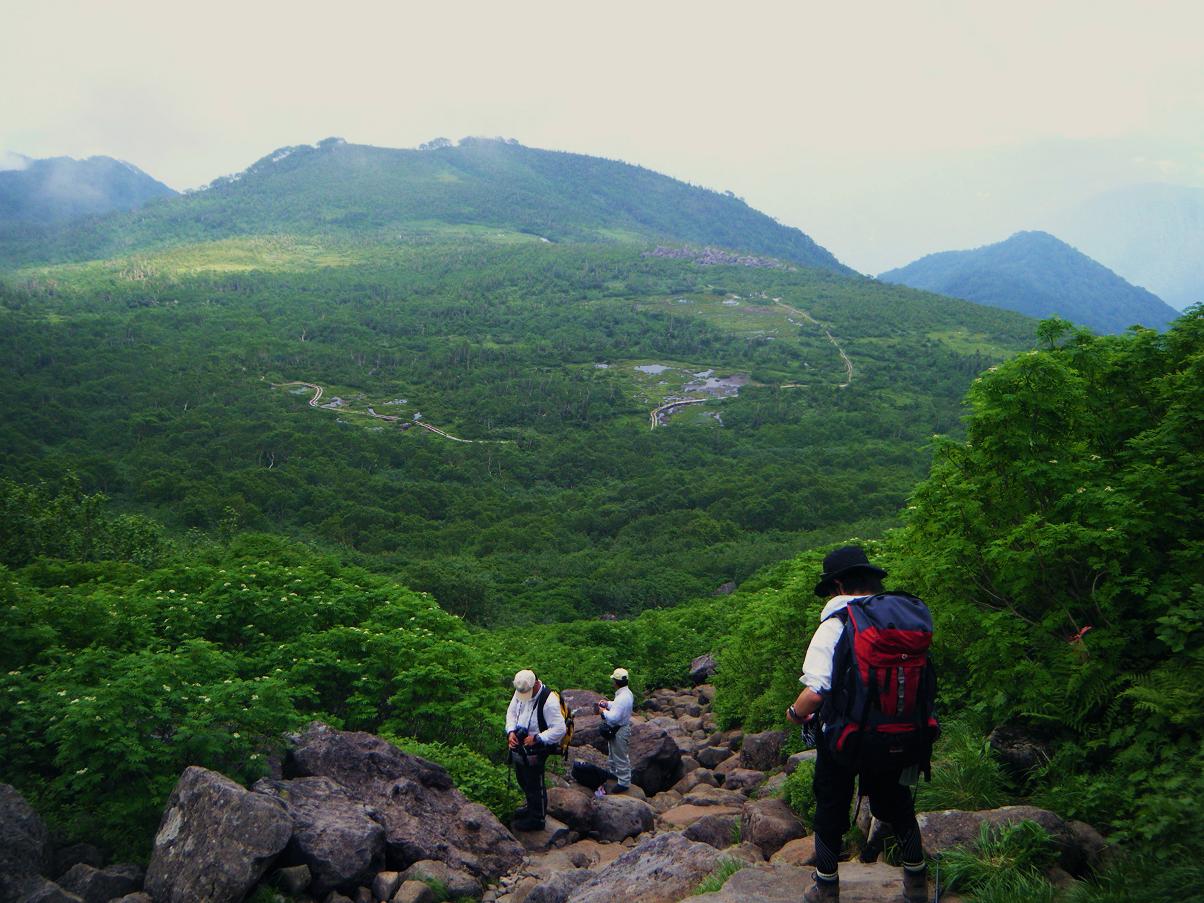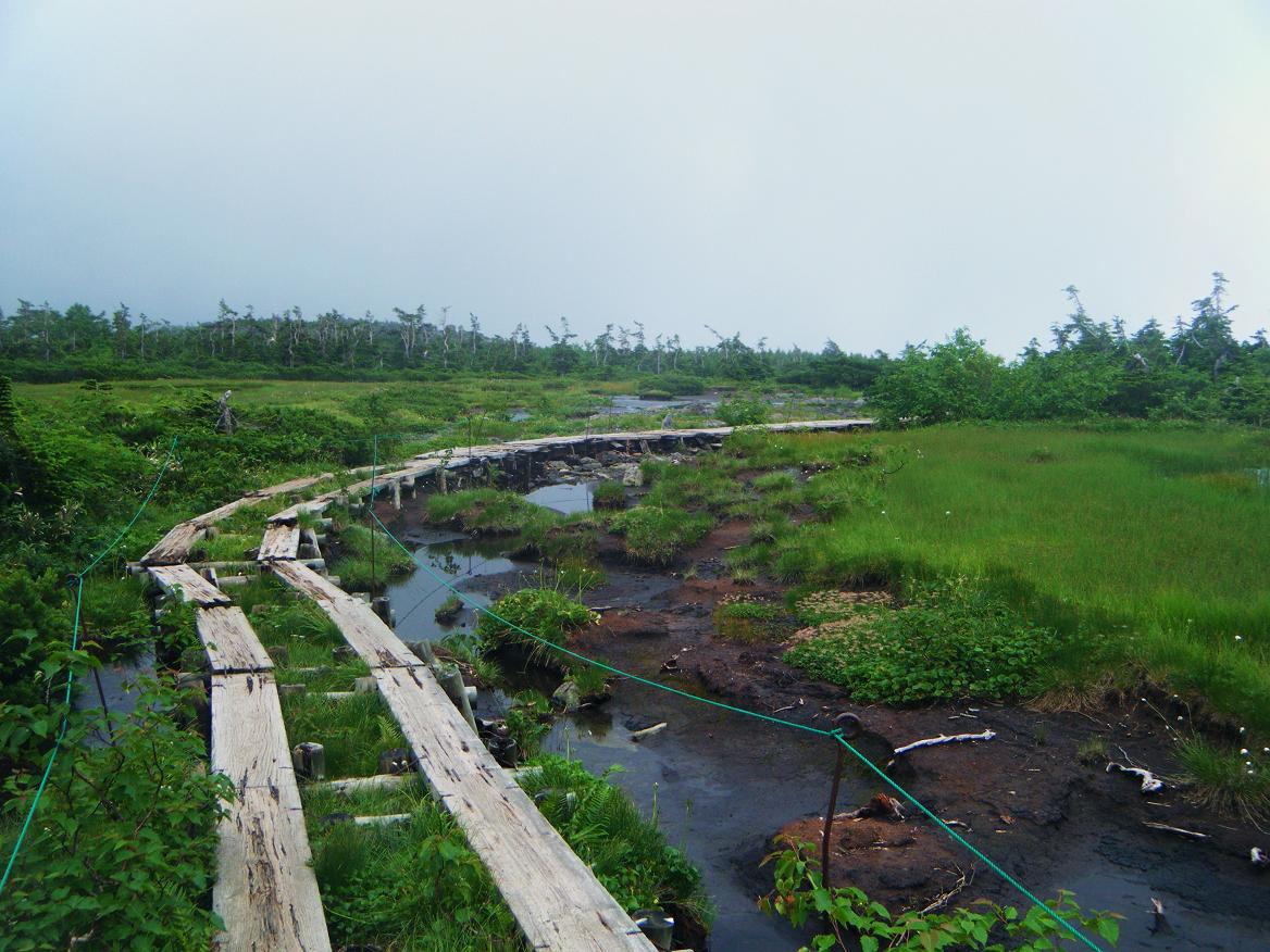 ガレ場も終盤を迎え、眼下に草原というか湿原が見えてきた。天狗原だ。ついにここまで下りてきたか。もうひと頑張りして天狗原に到着。北海道の春国岱とか行ったことないけど尾瀬みたいだ。ガレ場の下りから解放され一時の木道歩きを