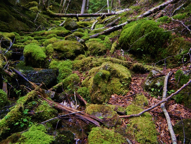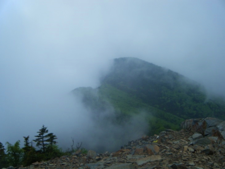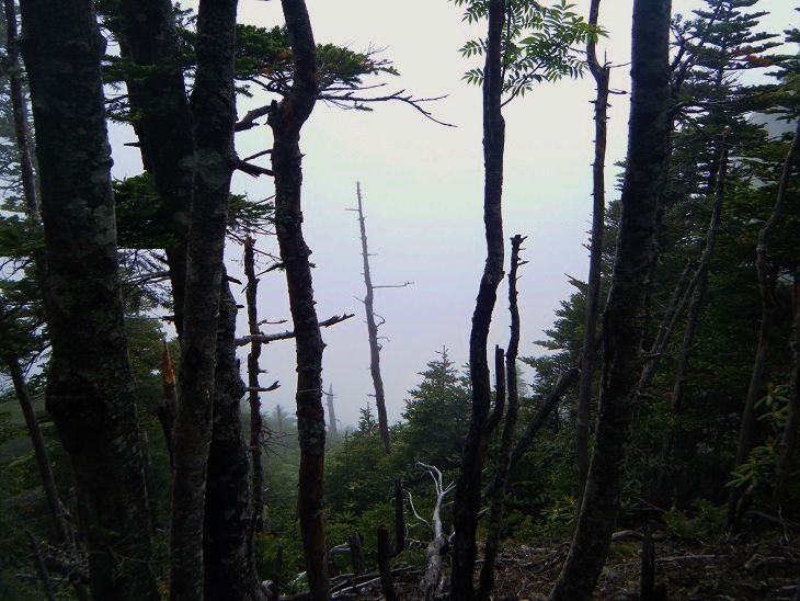 11時10分。毛木平に向け出発。再び甲武信ヶ岳の頂上に登り返すと晴れ間が出てきた。ガスっていることに変りはないけどさっきよりも多少周りが見えた。しばし山頂を踏みしめた後は下界向けて一気に下る。予想外に時間的な余裕もできたので一瞬十文字峠周りで下りようかとも思ったけどやはりやめておく。あちらを行けばぐるっと一周する縦走コースとなるが僕の大嫌いなくさりもはしごも出てくる。それに何より今日はツールん開幕日だ。1分でも早く下山して1秒でも早く帰宅せねばならぬ。