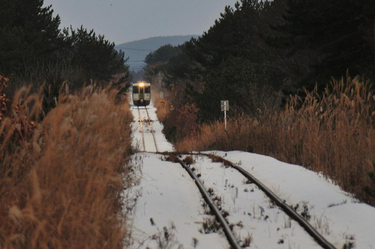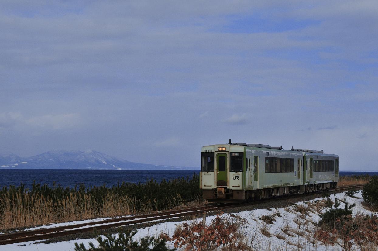 行きに入り損ねた浅虫温泉を再び通過。いやー入りたかったな。野辺地からは大湊線に乗り継ぐ。今回の目的は大湊線の超メジャーなお立ち台、有戸ー吹越間での撮影だ。列車は有戸を発車しここからは今回のハイライト、吹越までの陸奥湾をほとりをひた走る。大湊線は今回で3回目だけど正直過去2回の乗車での印象ってのはあまりない。1回目は大学生のころ。函館から大間までフェリーで来て大間港で野宿。翌朝バスで大畑駅に向かいそこから今は無き下北交通大畑線で下北まで来てその時初めてこの路線に乗った。2度目は7年前、山の相方のサークルの後輩K藤と折りたたみ自転車持参で尻屋崎まで走った時に下北駅まで利用した。印象にない理由としてはたぶん初めての時は車内で寝てて2回目の時はK藤としゃべっていたためのような気がする。(それすらもあまり覚えていない)