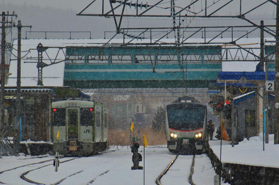 しかしよく考えてみると臨時列車があった。自前の時刻表を眺めているとこのスジだと陸奥横浜で上りとすれ違うんじゃないかと思って駅員氏(ここにはJRの窓口がないので青い森の駅員氏)に確認すると予想通り陸奥横浜ですれ違うことがわかった。それはこれから僕が乗る列車である。もう一回大湊線を心に焼き付ける意味でも暇つぶしの意味でも陸奥横浜までこの列車で行ってしまおうかと考えたけどなんとこの「快速あしなろ」は全席指定の列車であった。乗車時間たったの25分のために指定料金510円を払うのはあほらしい。結局乗るのをあきらめた。