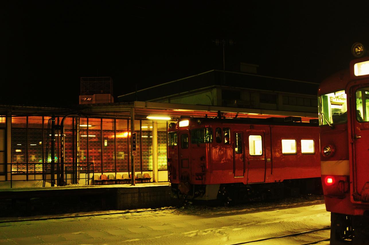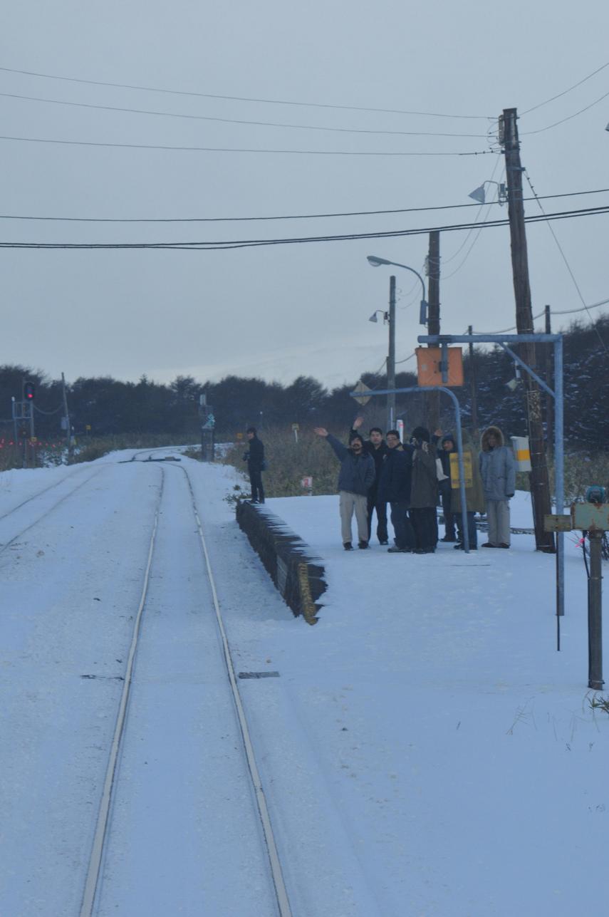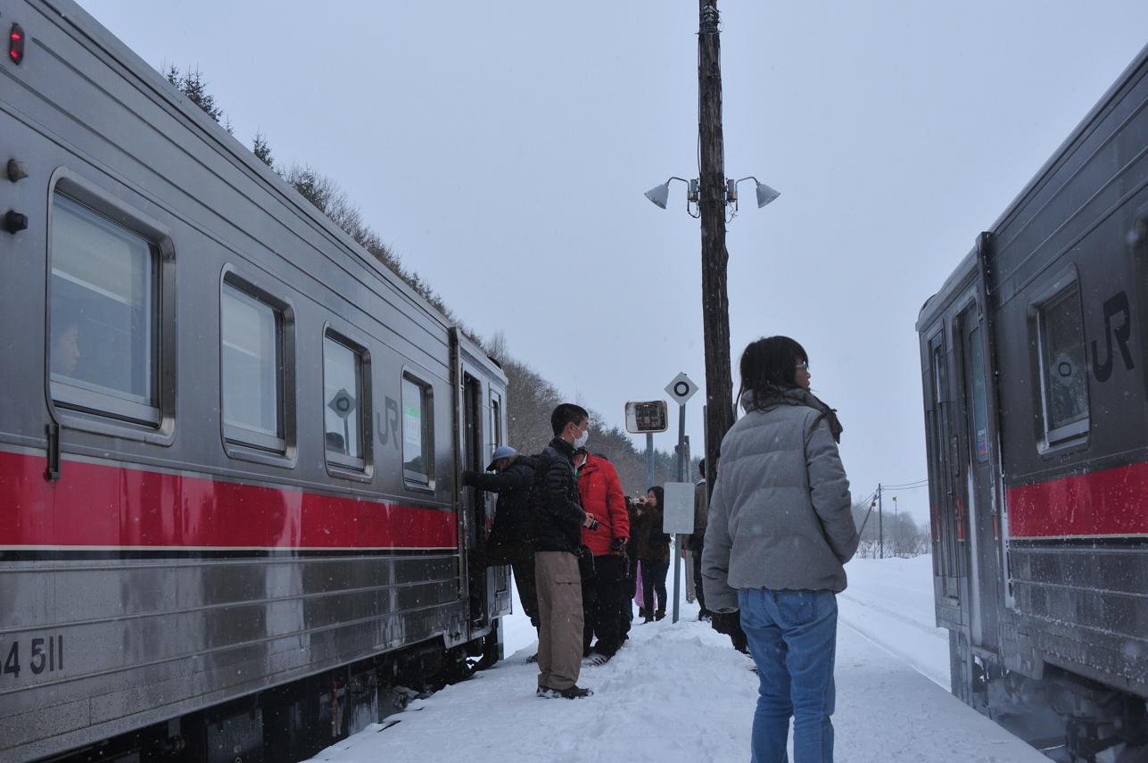 咲来で雪が降り出した。豊清水で列車行き違い。外に出る。車内が暑いので外に出るとひんやりしていて気持ちがいい。(多分外は氷点下)