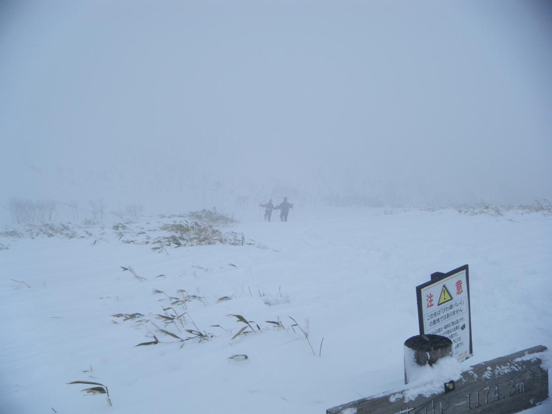 蓬莱山への登りにかかる。蓬莱山までは問題なく進めた。しかし問題はここからだ。前回もここから女郎ヶ池へと下っていくところで雪に埋まって進退極まった。ここまで来ると天候が悪化。ガスがわいて吹雪いてくる。前回と同じような天候へと変わっていく。GPSのルートに従い女郎ヶ池に向かい下っていく。先行者の足跡が残っている。まだ新しい。こんな状況でも先行者がいるということで勇気づけられずぼずぼ埋まりながらも下っていく。しかしそのトレースも少し進んだところでUターンしていた。ここであきらめたんだなぁ。蓬莱山まではスキー場の中を歩くので雪も圧雪されていて割と歩きやすい。しかしスキー場の場外となるこの下りからは完全に新雪のような状況で太腿の上の方までずぼずぼと埋まってしまう。前回来た時はスノーシューだったけど今回と同じようにずぼずぼ埋まっていた。こんな状況だからワカンだろうがスノーシューだろうが関係なく沈む。進もうにも一歩一歩いちいち沈んでいく。「これじゃこないだ停まった同じじゃないか」