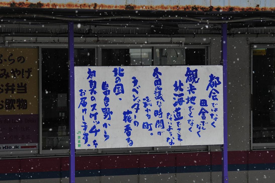 釧路行きの発車時刻は9:37分。ただし1両編成の列車は混雑するので9:15分にはホームで並ぶ。今年も僕が一番乗りだ。しかしすぐに2番乗りのおっちゃんが現れた。このおっちゃんもご多分にもれず紛れもない鉄。写真をぱしゃぱしゃ撮っていた。そういえば今回滝川の駅についてちょっと思ったことがある。これから乗る滝川発釧路行の列車が「日本一運行時間がなが~い定期普通列車」ってことでポスターになって張り出されていた。僕個人の意見としてはこういった感じで売り出すようなことはせずに知る人ぞ知る(つーか知ってるのは鉄だけか)隠れた名物列車として静かにしておいてほしかった・・・なんて小難しいこと言ってる場合じゃないな。とりあえずこういうことでも売り物にして一人でも多くの人に乗ってもらわないとな。乗って残そう根室本線。