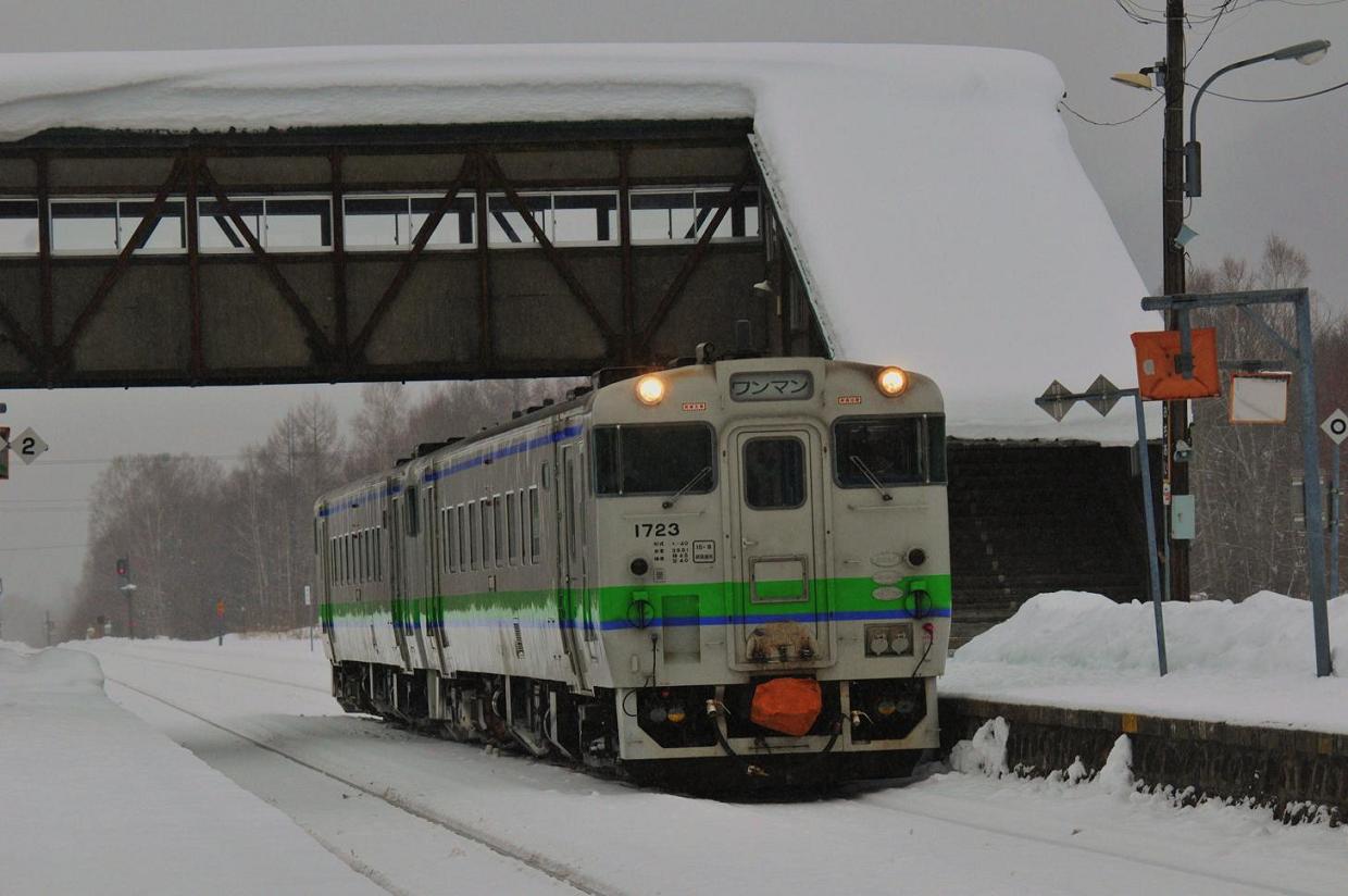 幾分車内にゆとりの出た列車に揺られ帯広方面へと進む。例年どおり凍りついた金山湖をのぞみ、ぽっぽやの幾寅を通過し、やってきました落合駅。数分停車するこの駅で定点観測的に写真を撮る。去年よりも少し少ないとはいえいい感じに雪が積もっている。なんか好きだなぁ、落合駅。別に何があるといいわけではないけどこの駅に来るのが楽しみだ。