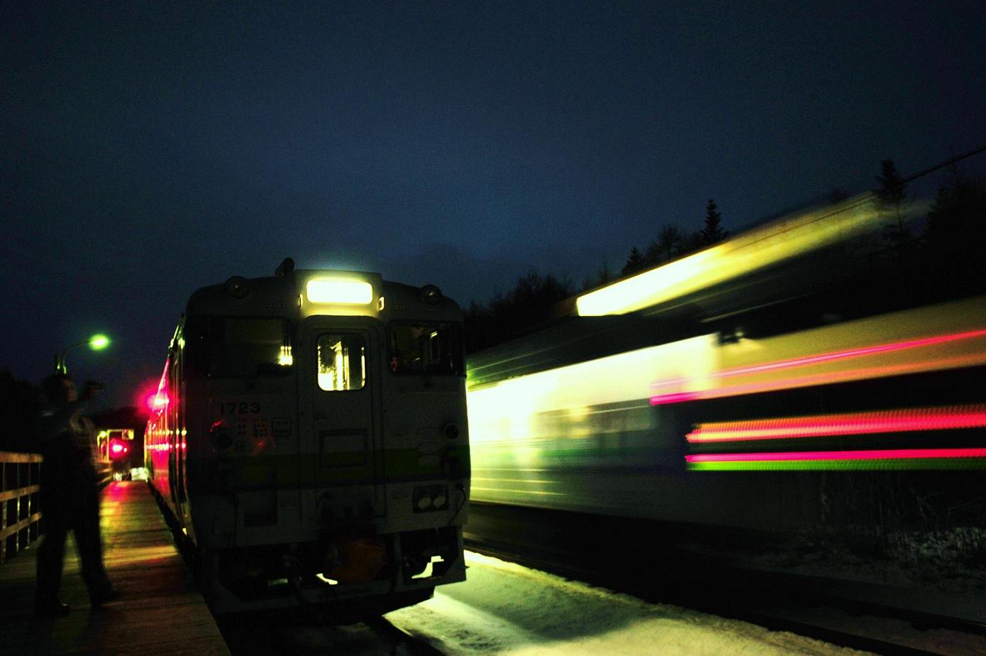 とっぷりと日が暮れて古瀬に到着。この駅も好きだなぁ。釧路からのスーパーおおぞら12号が札幌に向け駆け抜けていく。
