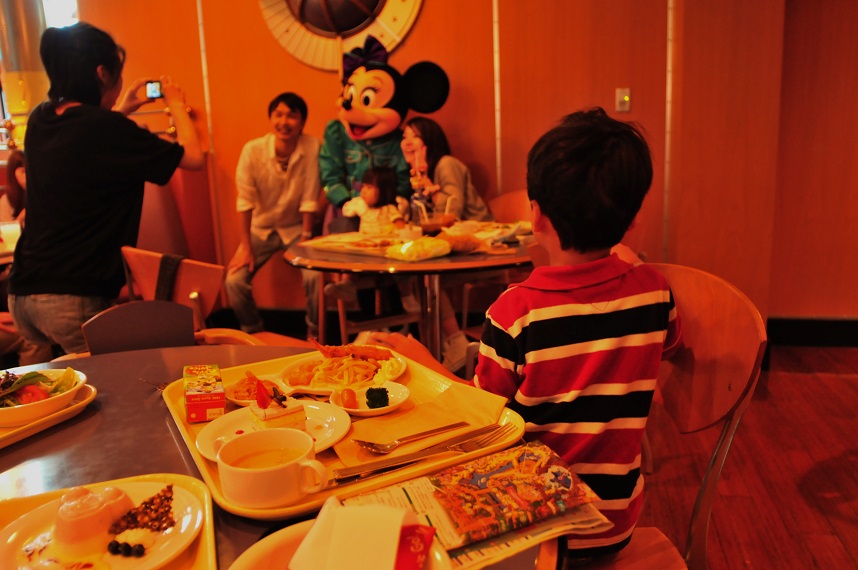 タートルトークを後にお次はレストランへ向かう。時刻は15時過ぎ。二時間前まで飯を食ってたのにレストランへ向かうのだ。当然腹は全く減ってない…というよりむしろまだ腹一杯である。なんでもここは飯を食ってるときにミッキーなんかがテーブルを回ってきて一緒に写真が撮れるという。しかし予約制ではなく時間も18時で閉まるというのでこんな無茶な状態で向かっている。嫁曰くこれよりも遅れると洒落にならんくらい並ばねばならんらしい。件のレストランに着くとすでに十分過ぎるほど行列になっていた。さてこのレストラン、入り口を入ると左右にテーブルが別れている。そして左側の方は全く人が並んでおらずテーブルも見える範囲では無人である。レストランの人も右と左ではっきり別れているようで右側の人達は鬼のように働いているが左側の人達は完全に開店休業状態だ。嫁に聞くと左側のテーブルはミッキー達が来ないテーブルらしい。ほぉ~、なるほど。ある意味アトラクションの一貫みたいなもんだな。もしここでバイトするなら間違いなく左側な方を希望する。まぁローテで回してるんだろうけど。さて30分ほど並びようやく席に座れた。行列を振ku槫ネ屬・・w)とドアの外まで連なっている。人のことは言えんがご苦労さんなことである。ここに来るまでは腹一杯だったけどいざ食べ物を目の前にすると普通に「うまそ~」ってな感じでモグモグ食べれる。そうしている間にミニーちゃんやらドナルドやら最後にミッキーさんもやってきて一通り一緒に写真も撮った。外を見ると行列はなくなっていた。嫁曰くあれ以降に来た人は足切りされたんだろうとのこと。いや~ホントに人気があるんだなぁ。