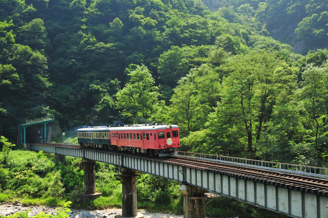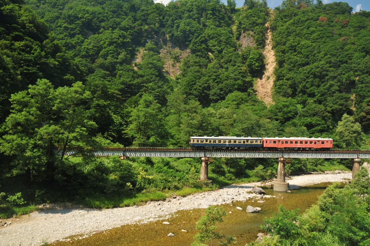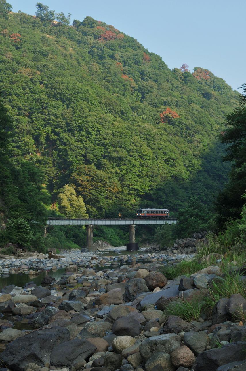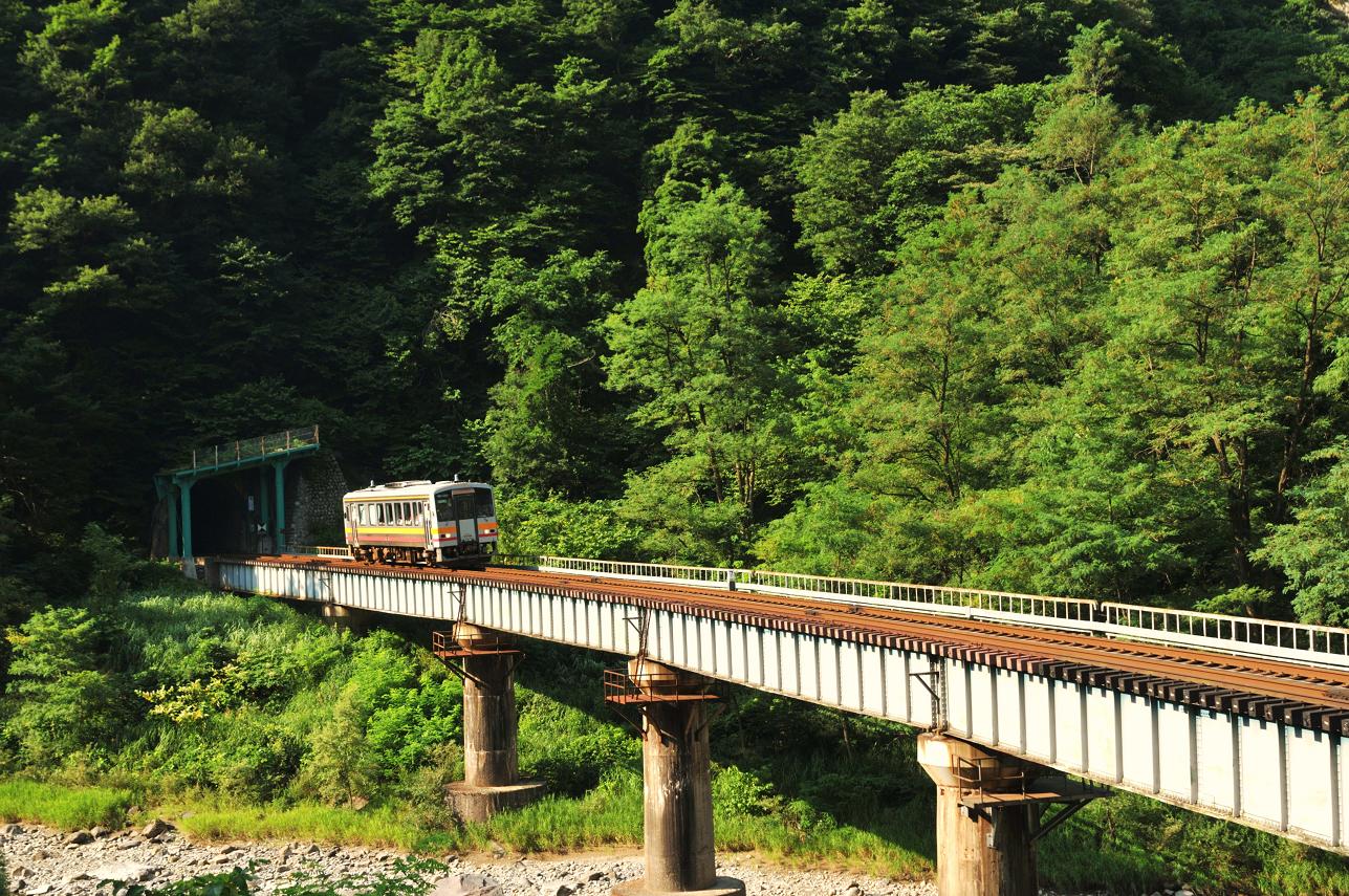 河原に下りていたもう一人の撮影者に挨拶をしてから道路へと上がる。次は約1時間後に下りの始発列車がやってくる。車に戻り休んでいると三河ナンバーの車がやってきた。その後神戸ナンバーの車が一台。2人ともトンネルから出て鉄橋を渡る構図で三脚を構えている。「んじゃオレも」ってことでその隣に三脚を構える。8時過ぎに下りの始発列車通過。撮影を終え神戸ナンバーの人と話をする。この後の行動の話になり「場所変えて南小谷発9時半くらいのやつ撮ったら帰りますわ」と僕が言うとその人は驚いた様子で「えぇっ!?キハ52じゃないんですか???」 その言葉に今度は僕がおったまげた。「えぇっ!?まだあれ走ってたんですか????」
