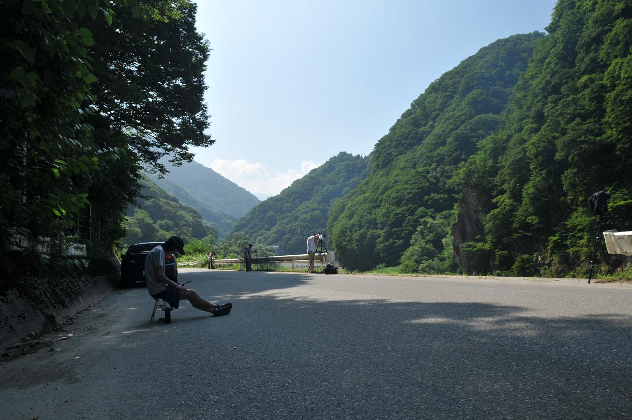 とりあえず9時7分に通過した南小谷行きを撮影し、その後は車で待機と撮影場所の往復を繰り返し(その間に9時7分に通過した返しの列車が通過)時刻は刻々とキハ52の通過時間へと近づいていく。撮り鉄軍団もだいぶ集まりJR西日本の社用車が警戒のために見回りに来る。最近各地で一部の頭の狂った撮り鉄野郎が問題を起こしているのでJRの方も心配なのだろう。しかし長いなぁ、まだ1時間半以上あるよ。しかも暑いし・・・。周りの人たちも熱中症対策でみんなタオルを被ったり水分補給に余念がない。僕はというと強烈な真夏の日差しのせいで顔や手足が日に焼けていた。前日の登山ではしっかりと日焼け対策を講じてきたけど、まさか今日がこんなことになろうとは思ってもなかったので日焼け止めを塗っていなかった。