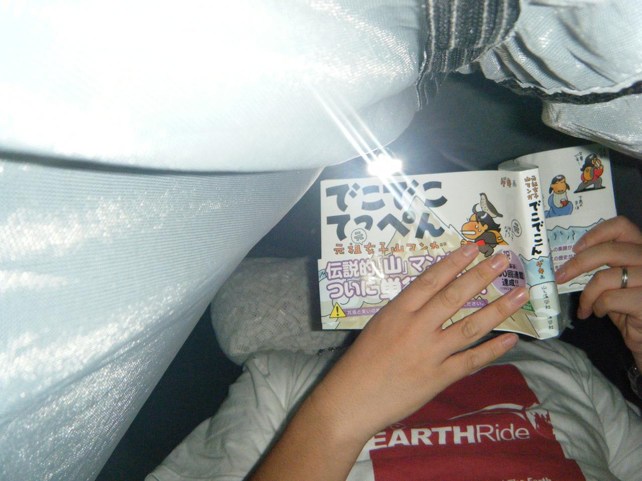 季節は夏に近づいてるなぁ。完全に日が暮れた。ヘッドライトをつけ本を読む。まだ蚊とかはいないと思うけど蚊帳を着ける。中に入ってデコデコてっぺんを読む。チビがおもちゃ代わりに僕のデジカメで写真を撮る。チビにおとなしくしろと言っても無駄なので好きなようにやらせる。今夜は久々に外で寝ようと決める。このハンモックで夜寝るのは初めてだ。明日は自転車のレースだからとっとと寝よう。