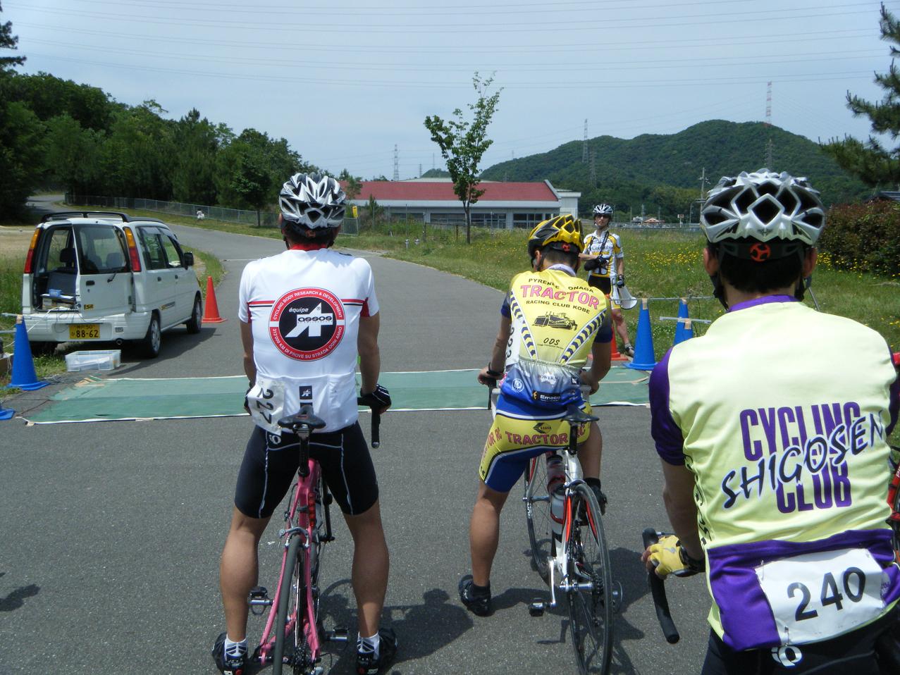 現地に着くと駐車場は自転車野郎の楽園と化していた。車の周りにはたくさんのロードバイク。「これからレースしまっせ!!」というムードにあふれている。気軽にエントリーしたものの皆様本格的。ローラー台を持ってきてアップをしてる人もいる。生まれて初めてのレース参戦だけにどーなる事やらさっぱり予想ができん。当初13時スタートの予定だったのが15分遅れて13時15分スタートになった。コースを一周試走してスタート地点に向かう。周りを見渡すと皆様やっぱり手ごわそう。なんだかサラブレットの中に1匹ロバが迷い込んだような気分だ。