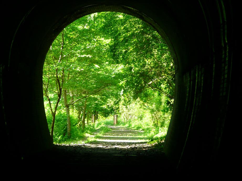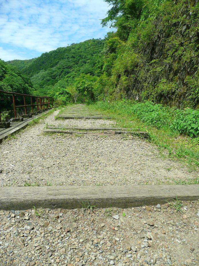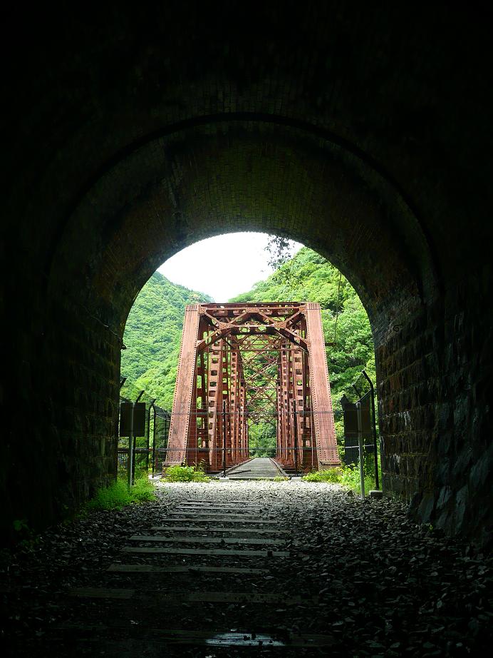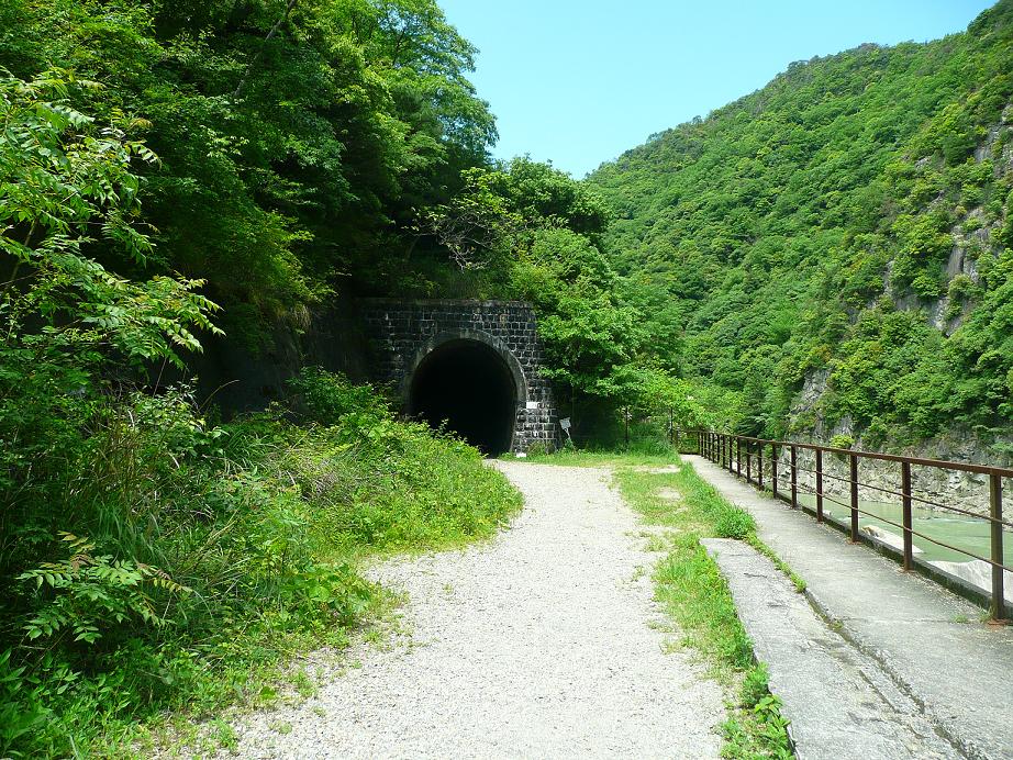 今日チビと一緒に武庫川の廃線跡にハイキングに行ってきた。今回で2回目のこのコース、関西のハイキングコースとしてはかなり有名なコースだ。簡単に説明するとJR福知山線の生瀬ー武田尾間の旧線である。現在複線電化されていっちょまえに幹線みたいな顔をしているけどほんの少し前までは単線非電化でDD51が客車を引いて走るような完全なるローカル線であった。で、この線を複線電化する際に武庫川の渓谷沿いを走るこのルートを廃止し生瀬ー武田尾間をトンネルでぶち抜くという新ルートが開通した。今日歩くのはこの廃止されたルートである。生瀬で電車を降り176号沿いに北上する。中国道の高架をくぐったあたりで右手の道へと進み田んぼのある方向へと下っていく。そして未舗装の道となったところからこのハイキングコースが始まる。天気は快晴。ほんとに気持ちの良い天気だ。田植え中の田んぼを眺めながら少し進むとJRのたてた看板が出てくる。内容を簡単に言うと「この旧線は福知山線の旧線でハイキングコースじゃありません。鉄道の使命を終えて保守もしていないので立ち入り禁止です。落石等の事故が起きても一切責任持ちません。」といったもの。まぁ当然だろうと思う。JRの管理地の廃線跡を勝手に歩かれて鉄橋なんかで勝手に転落事故なんか起こされてそのうえ裁判沙汰になって損害賠償なんて話になったらやっとれんだろう。いちおうこうやって自己責任でやってねということをアピールしておかないと。それでもハイキングの本なんかで堂々と紹介されているにもかかわらずこうやって黙認してくれているJR西日本の懐の深さに感謝しつつ、看板を無視してコースへと足を踏み入れる。気持ちの良い新緑&ダイナミックな武庫川渓谷を眺めながら心が洗われる思いで歩く。歩き始めて何分もたっていないのにチビが「お腹がすいた」と言い始めた。家を出たのが11時過ぎ。早くも時刻は12時半だ。仕方がないので早々に嫁が作った弁当を食べる。その間に右から左からハイカーたちが行き来する。人気のコースだし天気もいいからみんな楽しそうだ。チビのお腹を満たし先を進む。早速最初のトンネルが現れる。このコースの醍醐味は武庫川渓谷の美しさと武田尾までいくつも通過するトンネルだ。実はチビはヘッドライトを付けてこのトンネルを通るのをとても楽しみにしていた。先日これまで使っていたエバニューの安物の(決してエバニューが安物という意味でなくエバニューの安価なタイプという意味です!!)ヘッドライトをチビに譲り自分