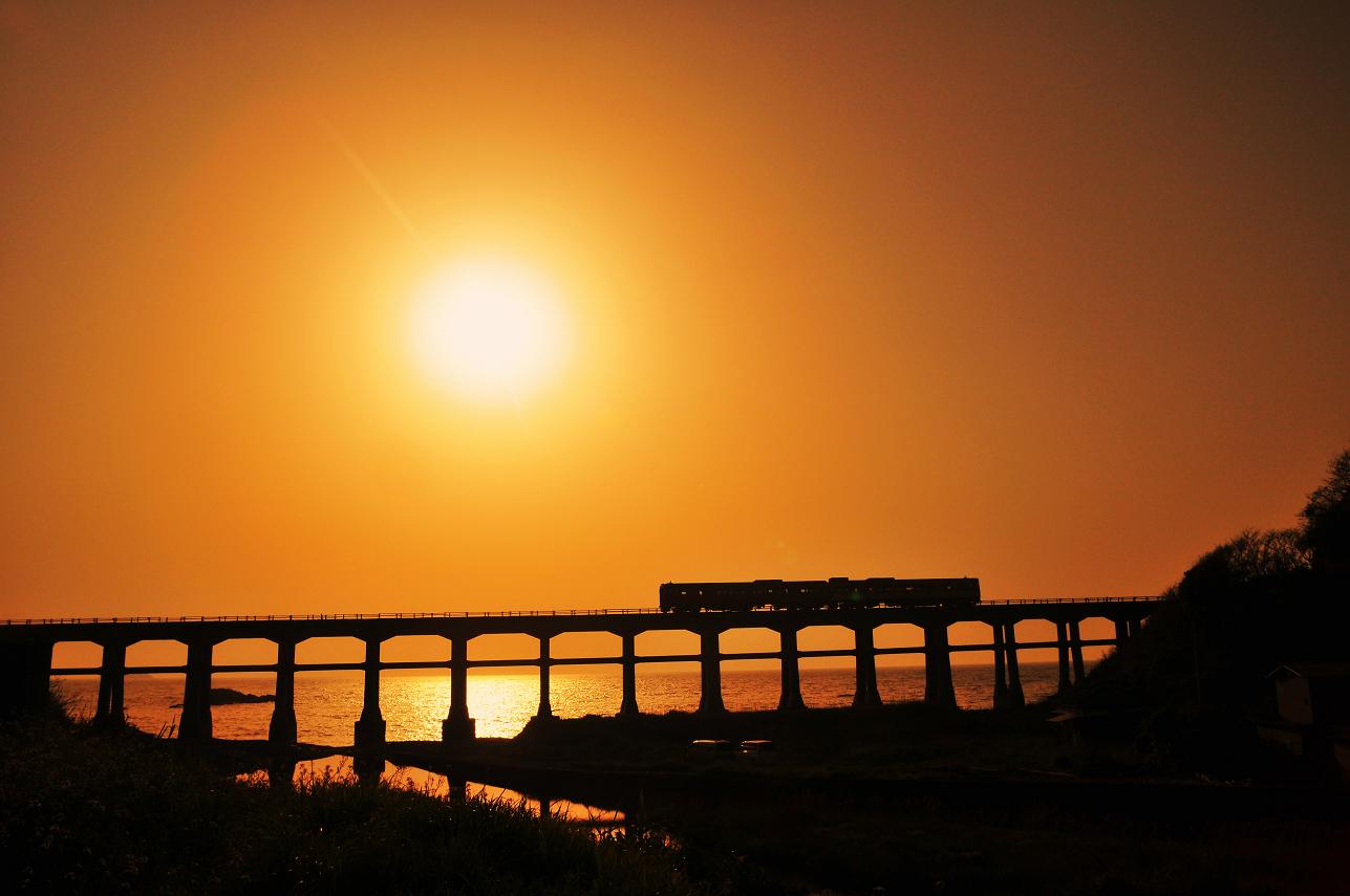 後ポイントを変え登り列車を待つ。光的にはいい感じに夕方モードになってきた。とはいえ晴天モードだと何の変哲もない写真になってしまうのでちょっと手を加えるためホワイトバランスをKモードにし、色温度を高くして下り列車を撮影する。するとばっちり夕方っぽい写真となった。満足満足。時刻は17時半に近い。やりきった感にみたされ実家へと戻る事にする。途中、信号待ちを利用して時刻表をくると三保三隅を18:48分に上下線のスーパーおきがすれ違う。この時間だとすでに日は沈んでいるかもしれないけどぎりぎり夕焼け写真が撮れるかもしれないと思いまたもやゆうひパーク三隅へと急ぐ。列車には間に合ったけどその直前に太陽は沈んでしまった。夕焼けの名残は残っていたけど写真を撮るには10分ほど遅かった。夏場ならこの時刻が一番きれいかもしれない。また夏にでも来よう。でもその時も天気はいいんだろうか??強烈な雨男だけに少々不安だ。