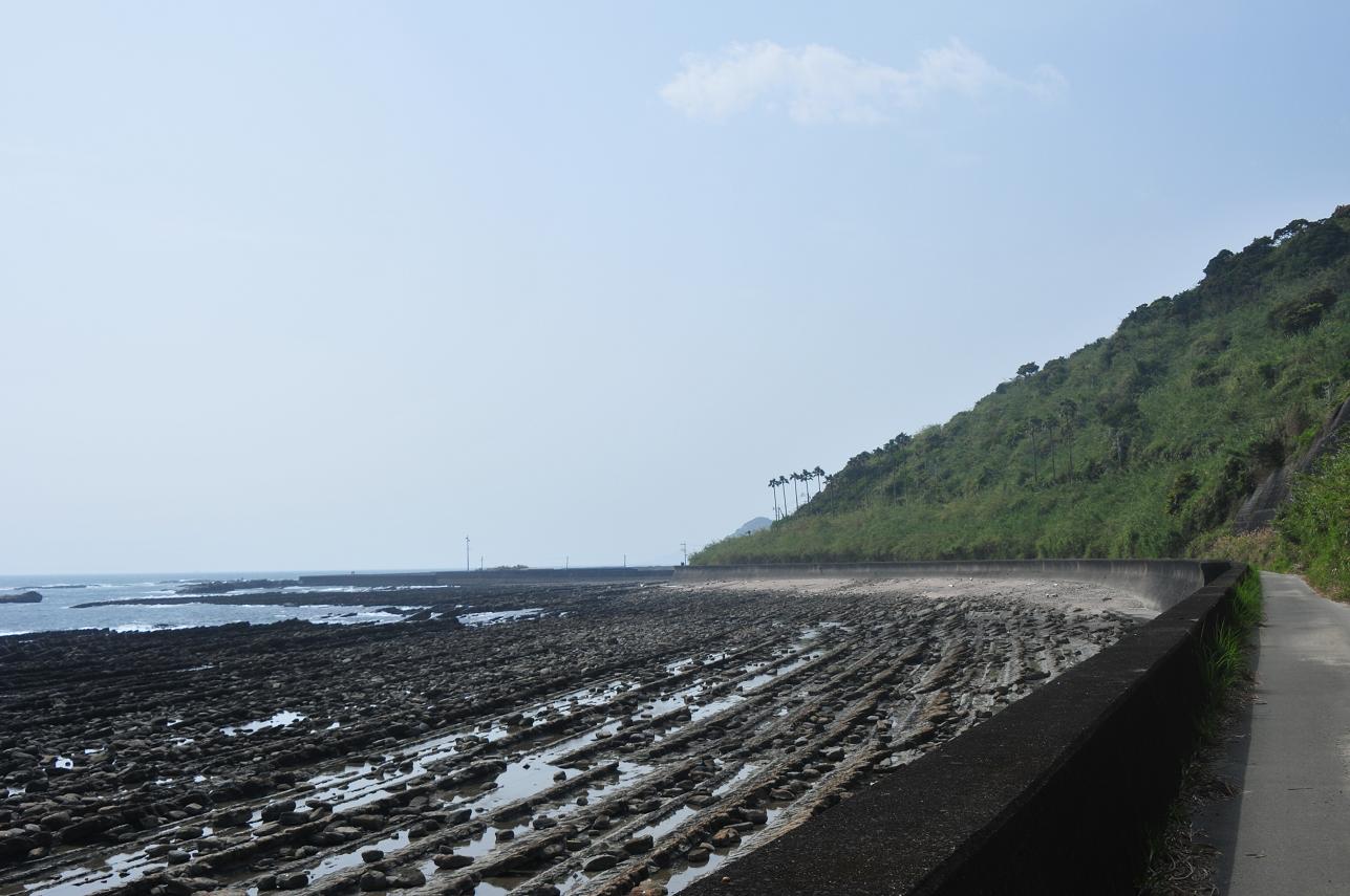 撮影し先へと進む。内海の漁港まで来て海岸沿いの細い道へ入り青島の駅の方へと引き返す。右手に鬼の洗濯板を見ながら気持ちよく進んでいくと自転車にさらなるアクシデントが!!なんとサドルが取れてしまったのだ。サドルがすぽっと抜けたのではなくお尻を乗せてるところが「パキッ」っと