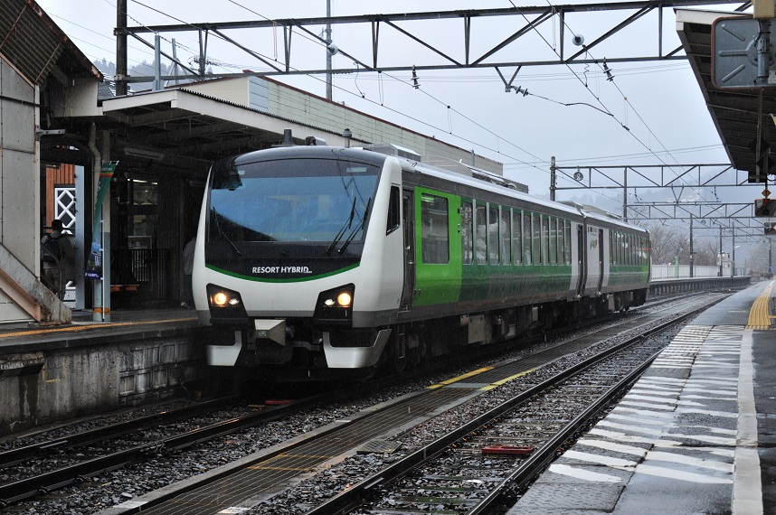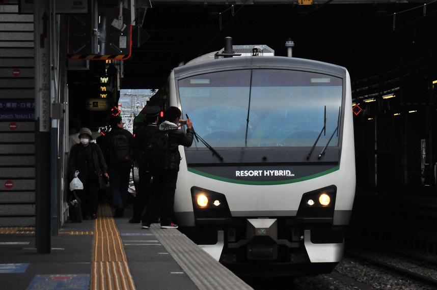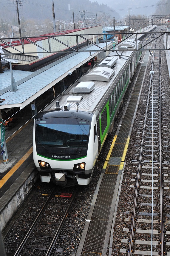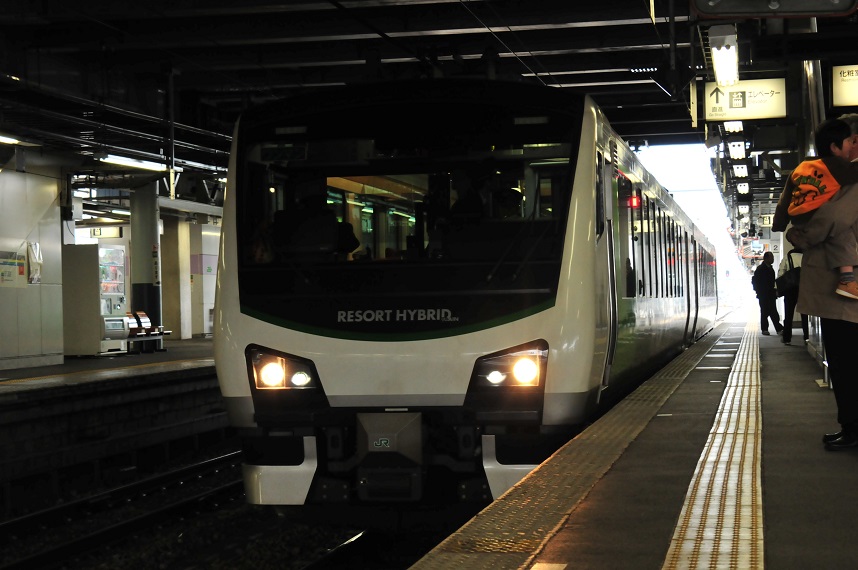 入線してきたのはハイブリッドのHB-E300系。おぉ~。