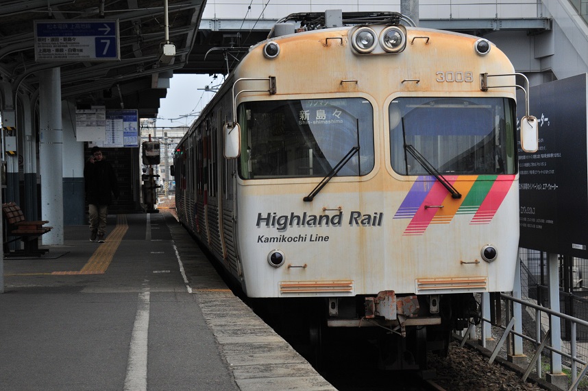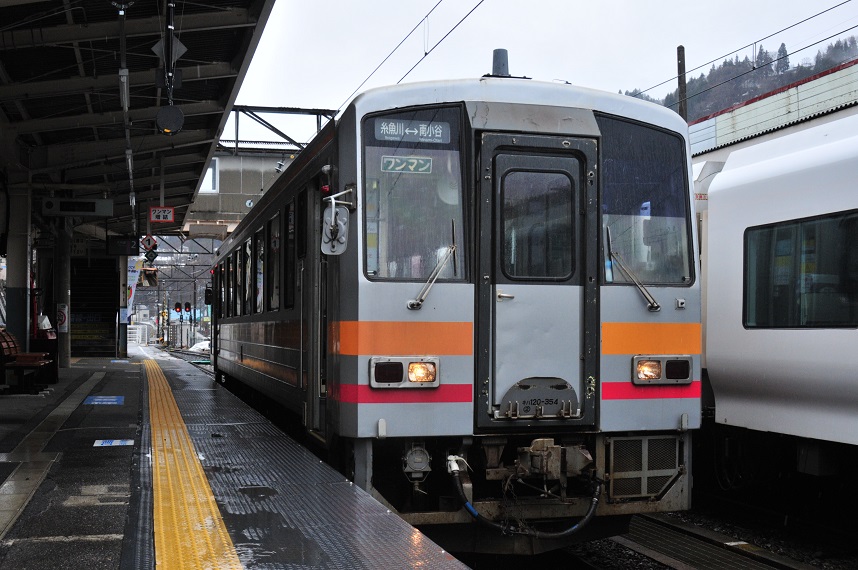 11時08分までまだ時間があるのでホームの立ち食いうどんに入る。そして天ぷらうどんの件を買っておばちゃんに渡す。すると「うどんでいいんですね??」などと聞かれる。一瞬「へ?なんかうどんじゃまずいですか??」と思いつつ「はい。うどんでいいです」と答えた。しかしよく考えればここはそば処の信州。ここではうどんを頼む奴の方が少ないのかもしれない。それどころか僕のうどんというチョイスは高松でそばを注文するのと同じくらいあり得ないことだったのかもしれん。「あ~そばにすればよかったなー」と思いつつも訂正はしなかった。出てきた天ぷらうどんをおいしく頂き、その後ホームの端にあるトイレですっきりした時には11時08分の南小谷行きが入線していた。しかし先ほど見た4連の211系ではなく、2連のE127系。ザ・大糸線って感じの電車だ。ちょっと落胆しつつも列車に乗り込んだ。