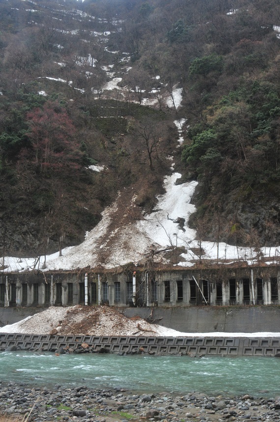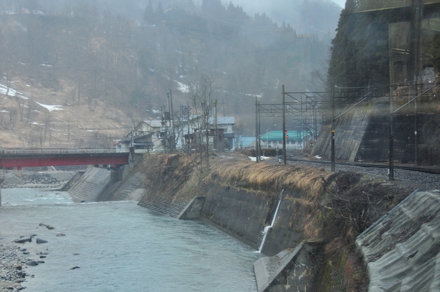 さて列車は糸魚川に向けて出発。次の中土辺りから非常に荒々しい景色になるになる。ここから先は列車から雪崩のあとが見えまくりの区間となる。はじめてこの区間を乗り通したのは大学卒業間近のかれこれ13年前だ。その時の怖ささえ感じるほどの荒々しい景色は強烈なインパクトがあった。